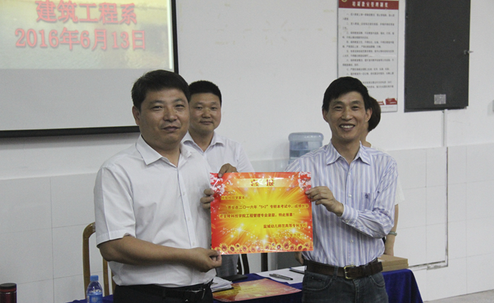 2016年6月13日下午,建筑工程系在二号教学楼9号阶梯教室召开了学习标兵经验汇报暨向家长代表颁发喜报大会,会议由周加林主任主持,学校过渡时期领导小组成员孙永龙教授出席,系部班主任和所有同学参加了大会。
