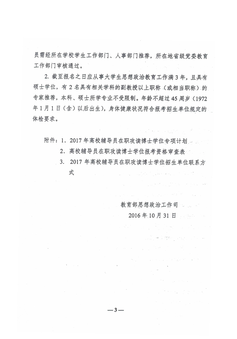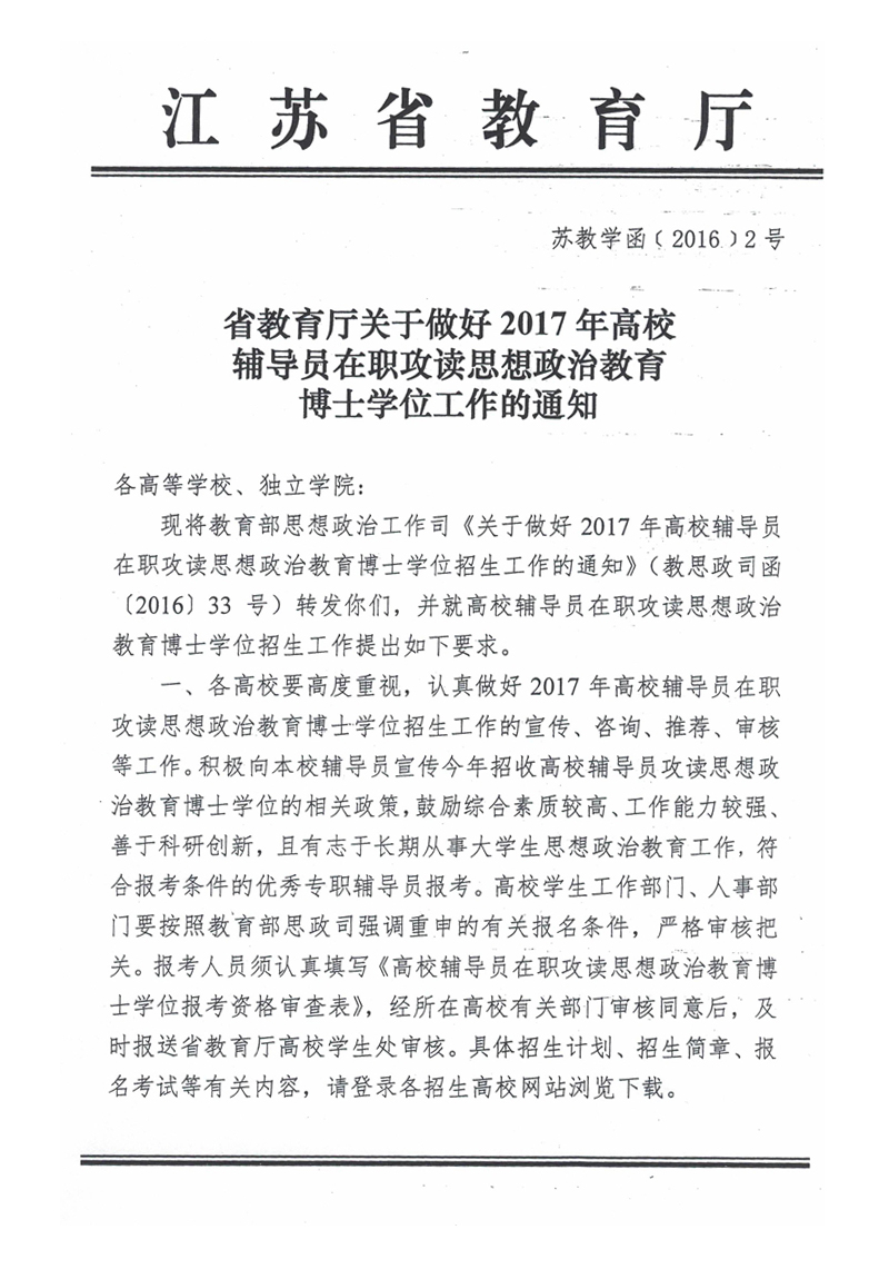 省教育厅关于做好2017年高校辅导员在职攻读思想政治教育博士学位工作的通知