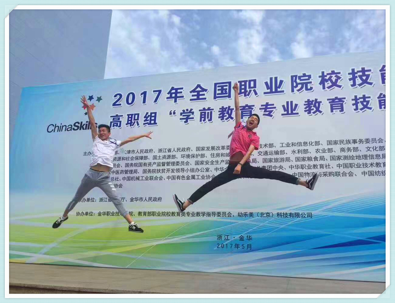 5月19日,2017年全国职业院校技能大赛高职组“学前教育专业教育技能”赛项在浙江金华落下帷幕。我校学前教育专业王济民、陈小豪两位同学不负众望,代表学校夺得一等奖。特向两位同学表示祝贺!希望他们再接再厉,在以后的人生道路中成就更大的梦想!同时,对刘玮、顾玲等指导老师的辛勤付出表示感谢!
