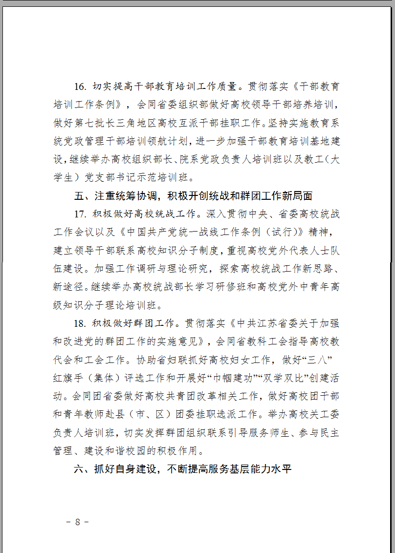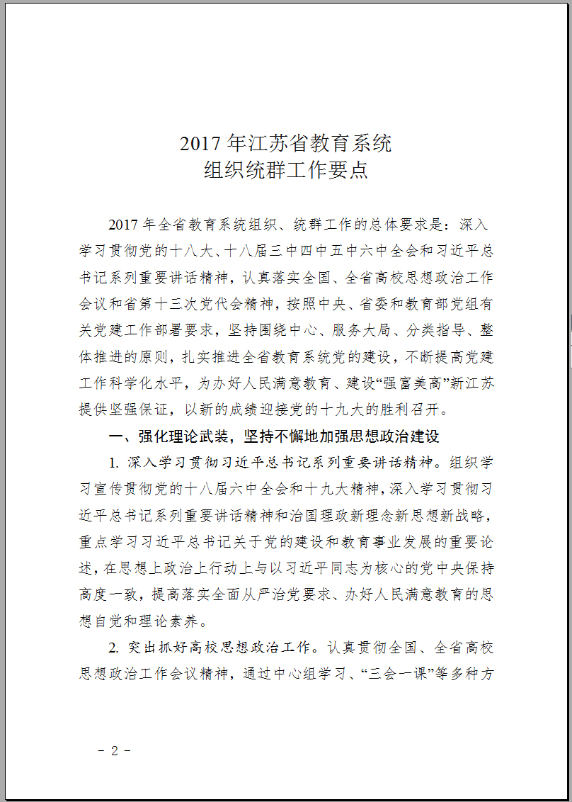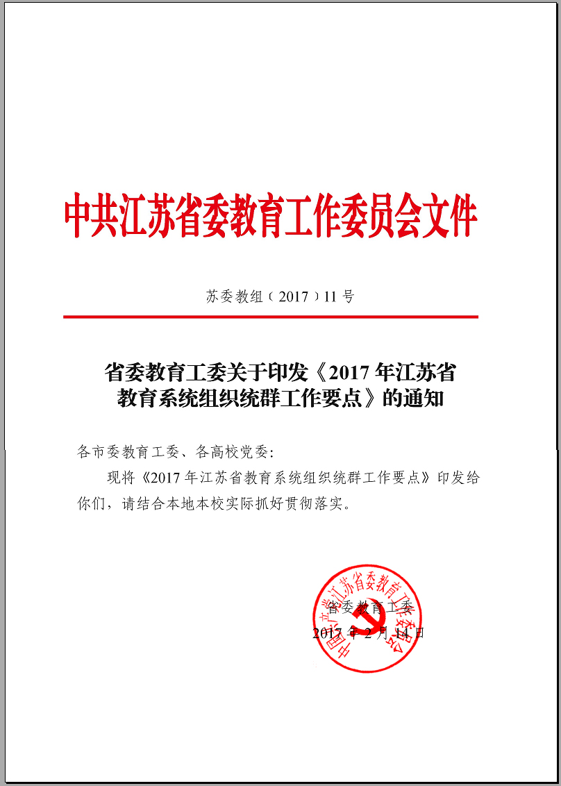 省委教育工委关于印发《2017年江苏省教育系统组织统群工作要点》的通知