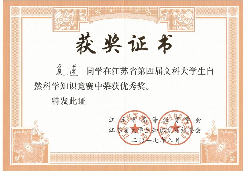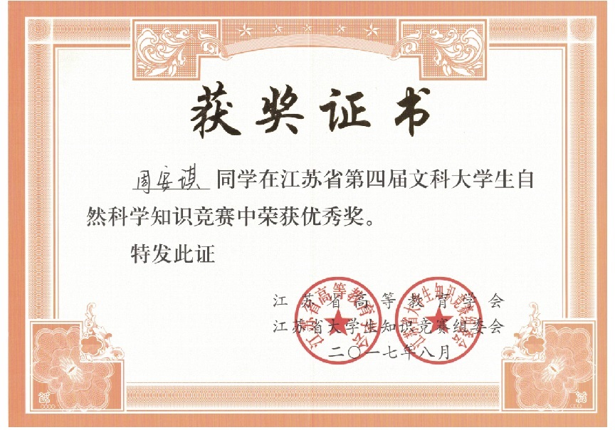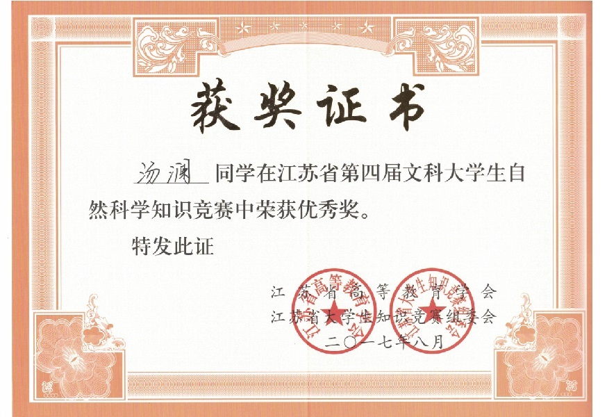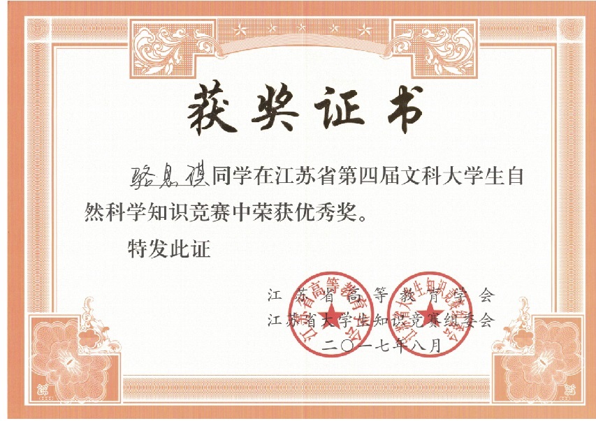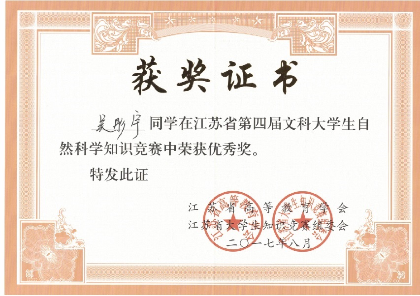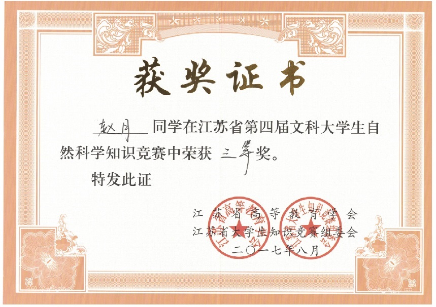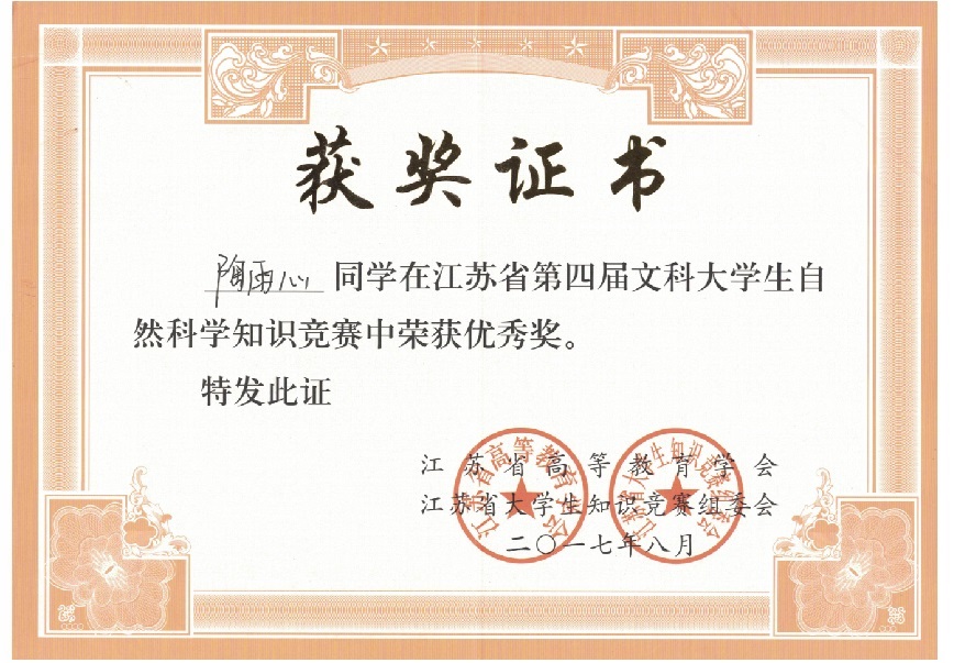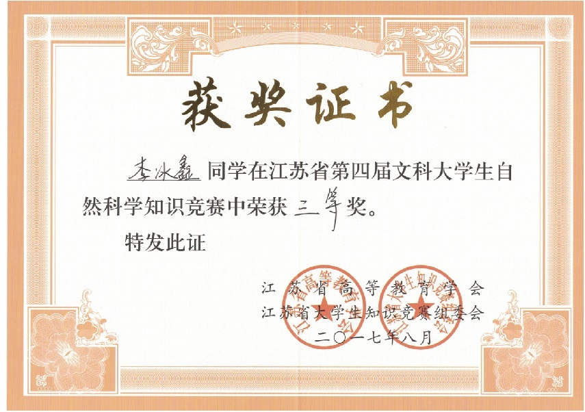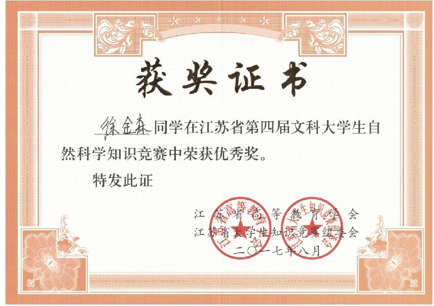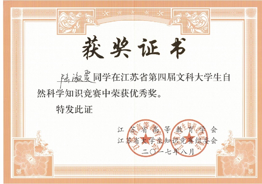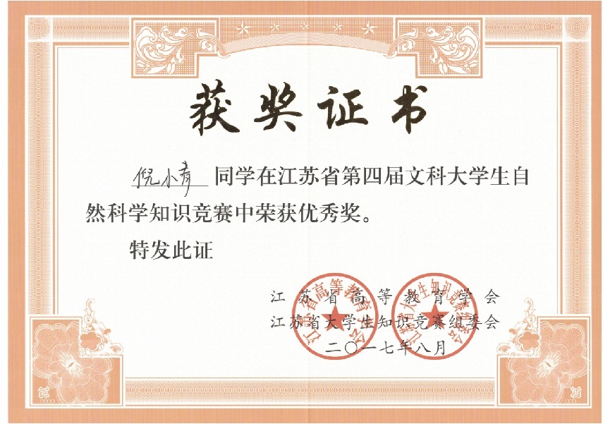 我校在“江苏省第四届文科大学生自然科学竞赛”中喜获佳绩:学生获奖二十多个,其中三等奖三人,优秀奖十八人;蔡旺庆同志获“优秀组织管理奖”;学校获“优秀组织奖”。我校第一次参加省大学生统一竞赛,获得如此成绩,可喜可贺,在此向为此工作做出辛勤奉献的各位同志表示感谢,希望全校师生继续努力,争取在省级以上的各项比赛中再创佳绩。