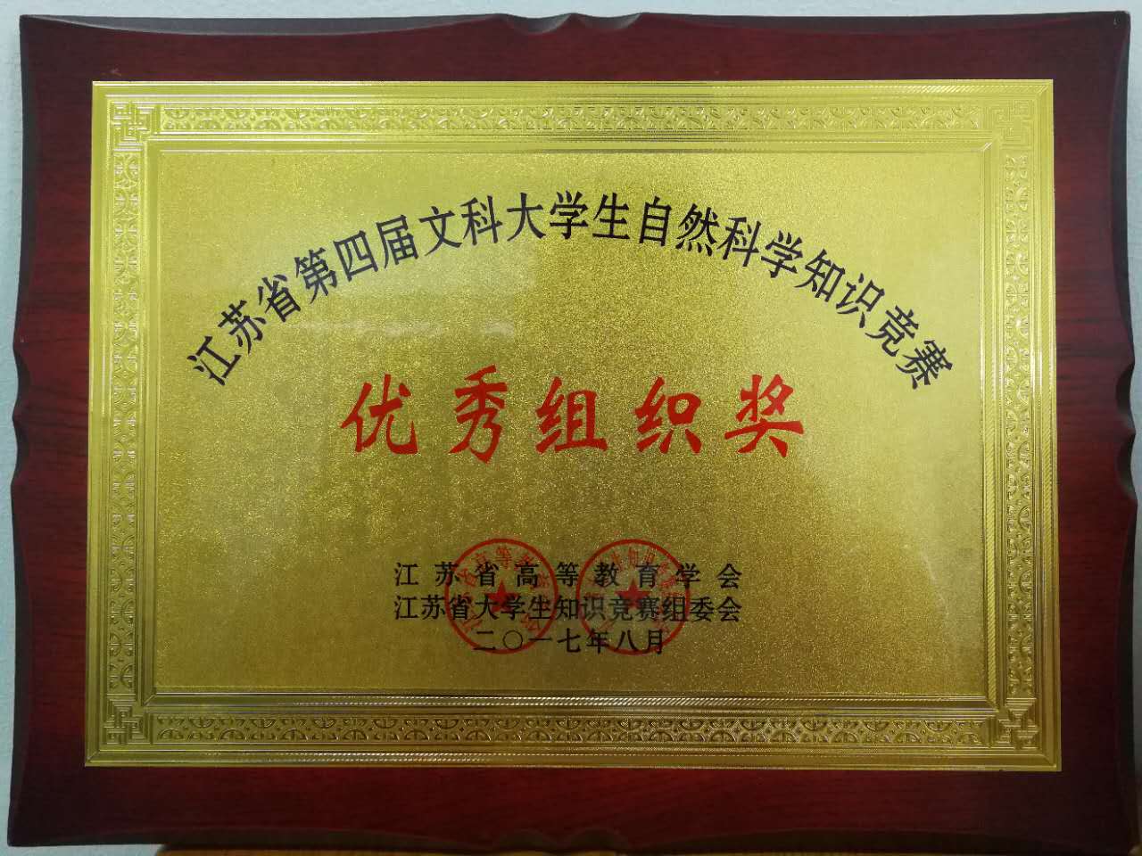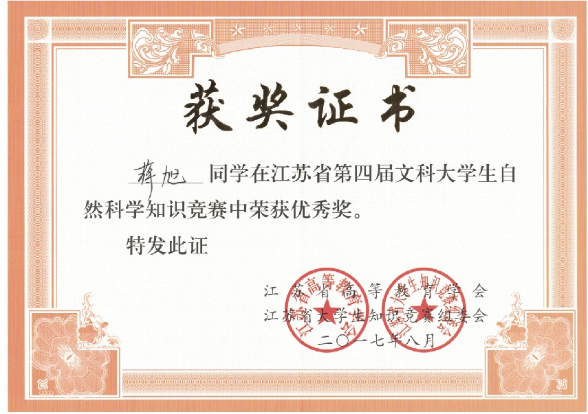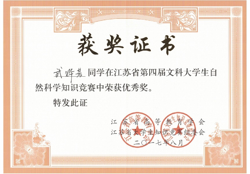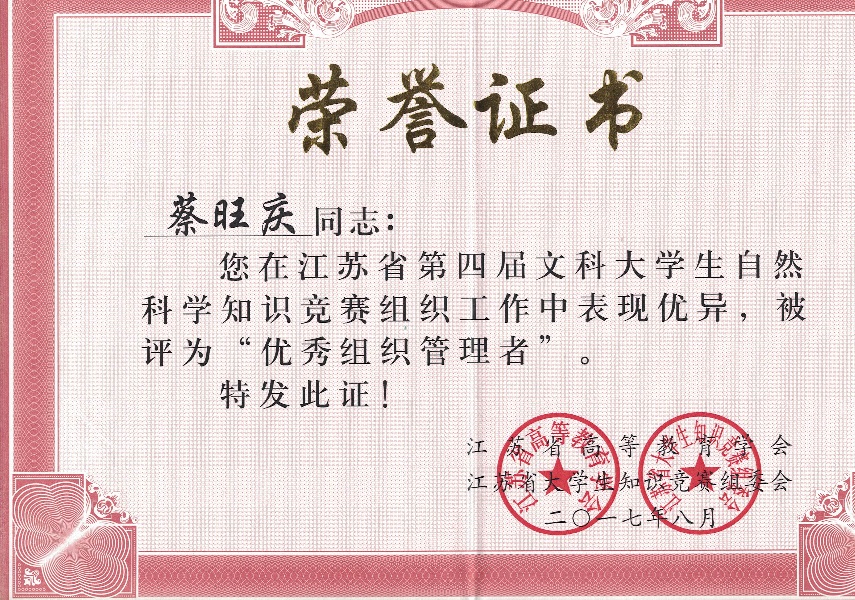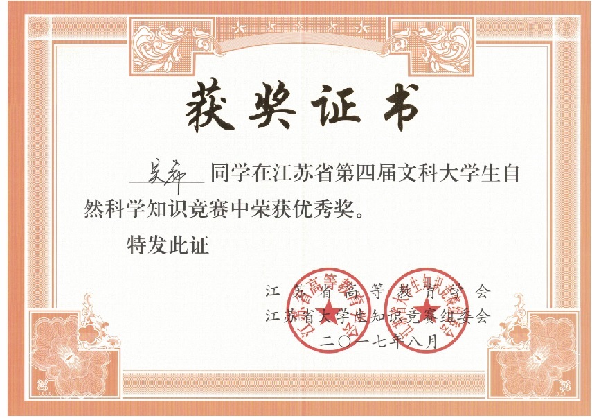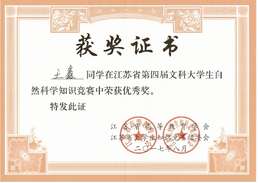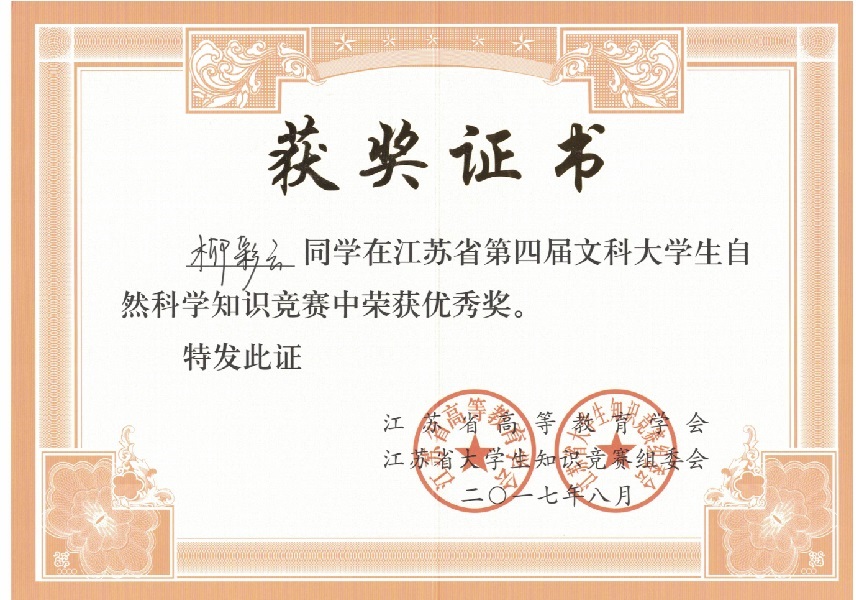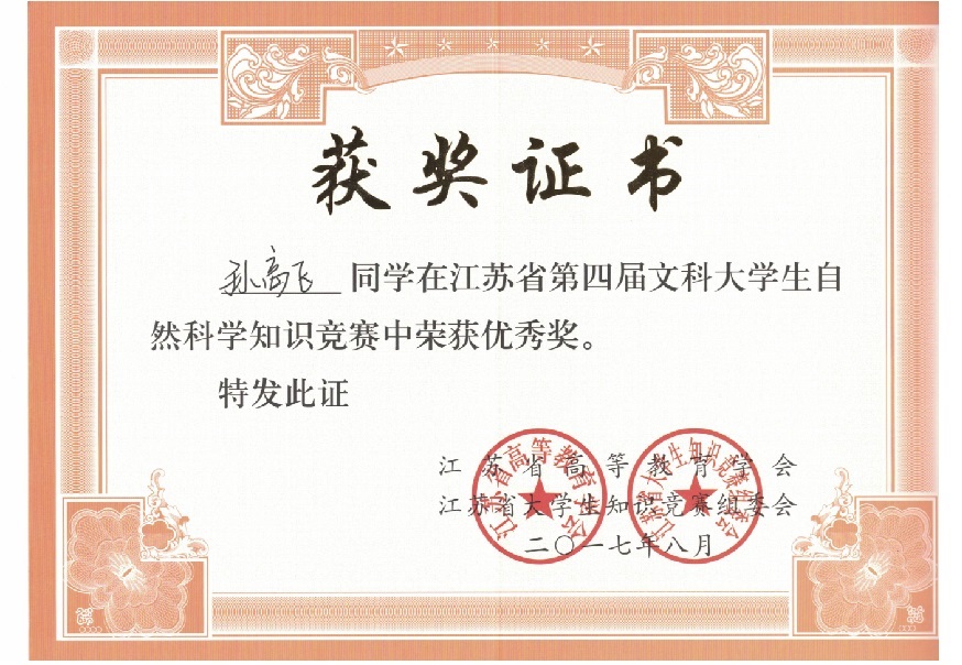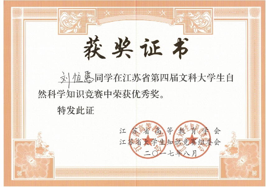 我校在“江苏省第四届文科大学生自然科学竞赛”中喜获佳绩:学生获奖二十多个,其中三等奖三人,优秀奖十八人;蔡旺庆同志获“优秀组织管理奖”;学校获“优秀组织奖”。我校第一次参加省大学生统一竞赛,获得如此成绩,可喜可贺,在此向为此工作做出辛勤奉献的各位同志表示感谢,希望全校师生继续努力,争取在省级以上的各项比赛中再创佳绩。