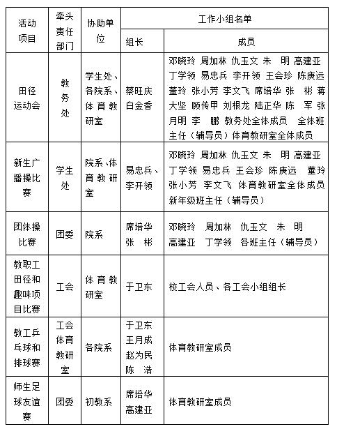秘书组:主要负责体育节暨田径运动会开幕式、闭幕式有关工作的安排。具体包括:会场布置、人员安排、大会程序、领导讲话稿等。组长:蔡旺庆、白金香,副组长:周甫林、戴兢兢、夏万杰。成员:管明、崔兆兵、朱志祥、王燕燕、曹卫忠、夏林、沈亚威、宋宇英。