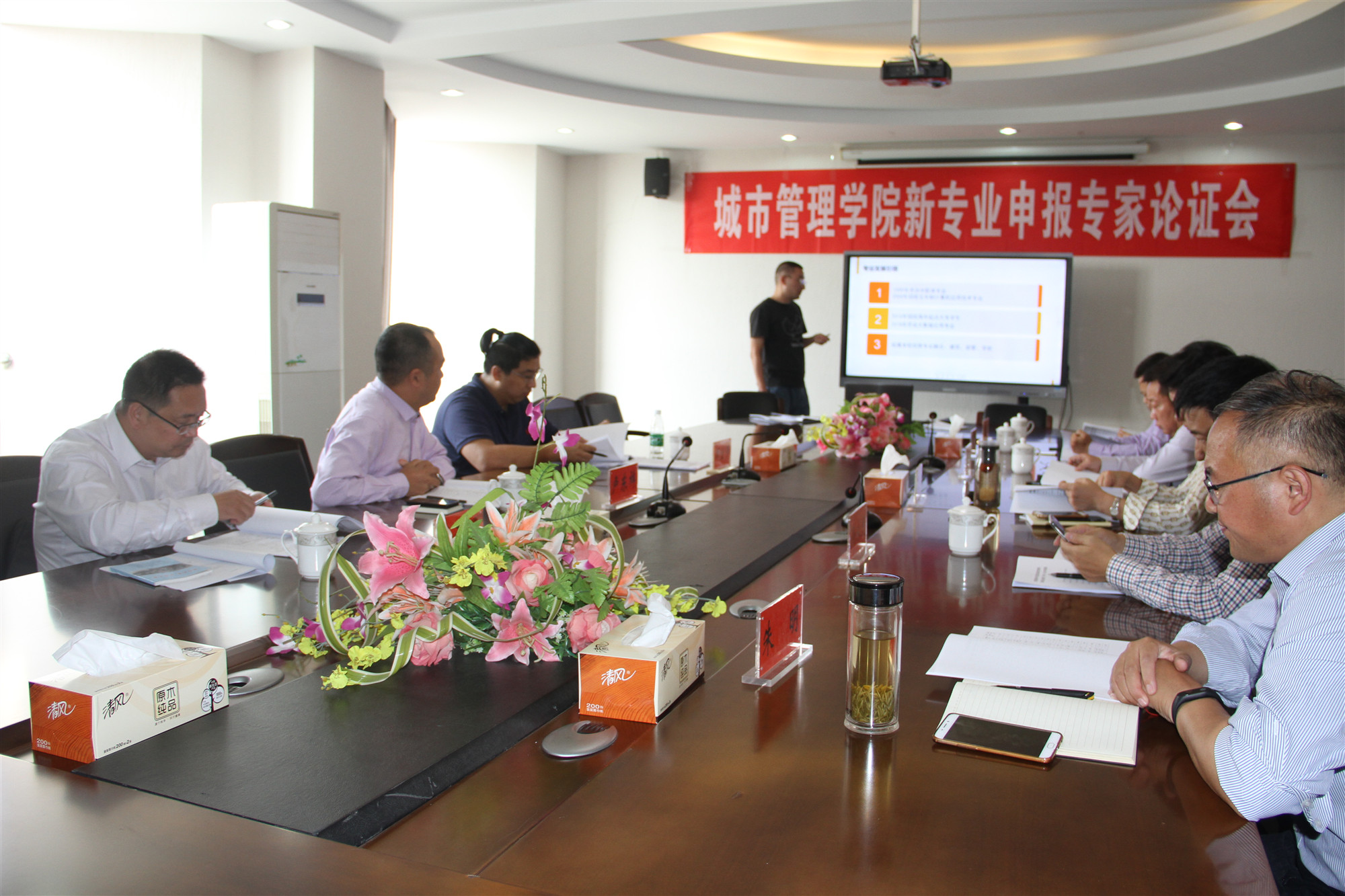 会议首先由城市管理学院钱光电老师对申请增设专业的理由和基础、申请增设专业人才培养方案、专业设置可行性等方面进行了讲解,与会专家对专业开设的可行性进行了充分肯定,并提出了论证意见及进一步细化的方案,提出分清核心课程与通识课程,加强与大数据产业园和相关企业的合作,部分课程名称可更换为更贴近发展形势的专业名称等建议。校长姜统华指出智能产品开发是偏工科专业,人才培养目标中要明确培养方向,建议针对智能家居一线人员进行培养。刘毓航书记提出几点要求:一、方向明确,定位精准。进行充分调研后定位,要立足于管理与维护。二、充分进行政产学研合作,利用周边有利环境,进行人才培养;三、聚众核心课程,结合社会实际需求,将课程与产业、专业、职业对接起来,进行有效课程设置。