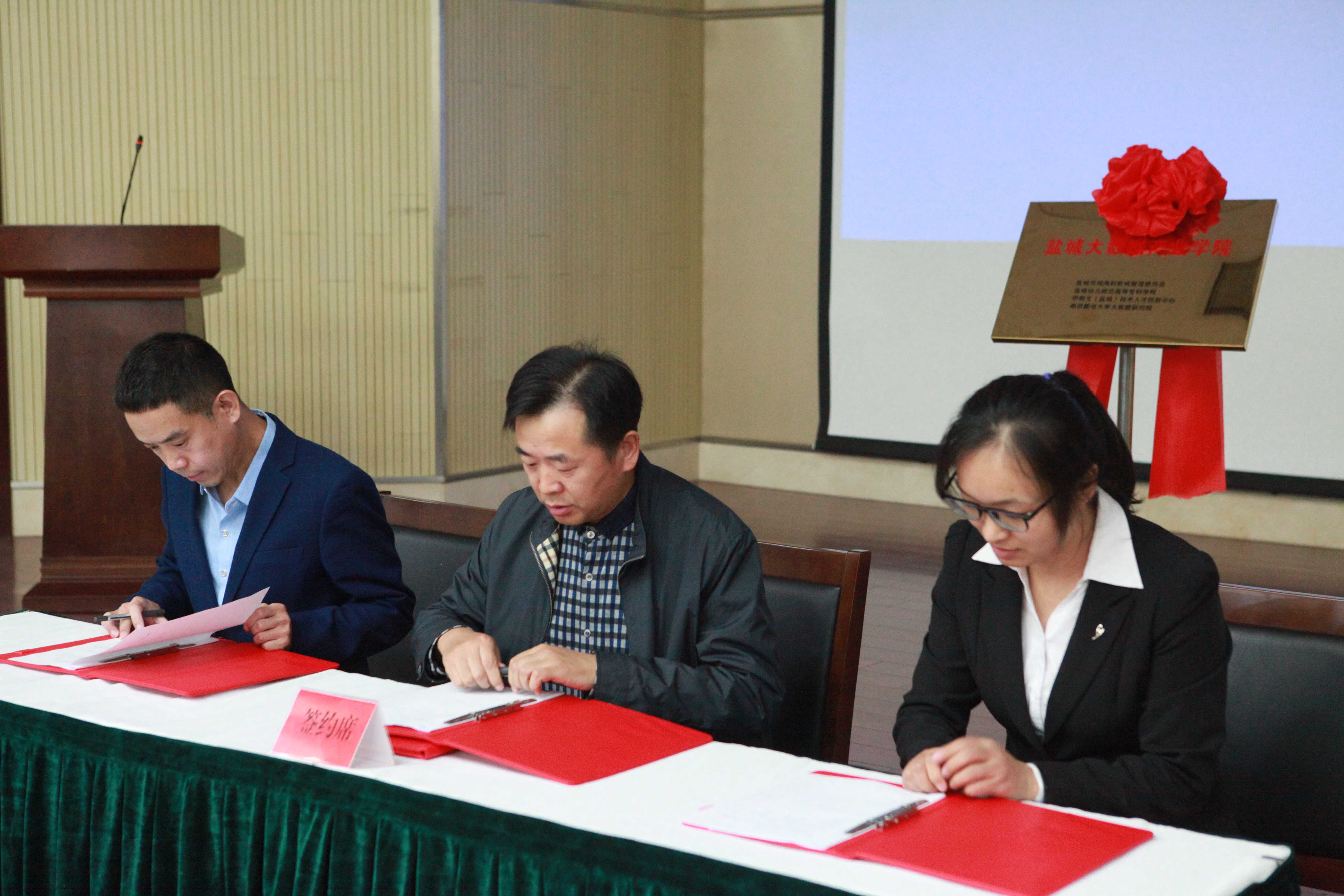 随后姜统华校长与盐城科教城管理委员会主任郭庆生共同为盐城大数据产业学院揭牌,校领导张体松与江苏沃叶软件有限公司、天眼查华东总部等企业代表进行冠名班签约。