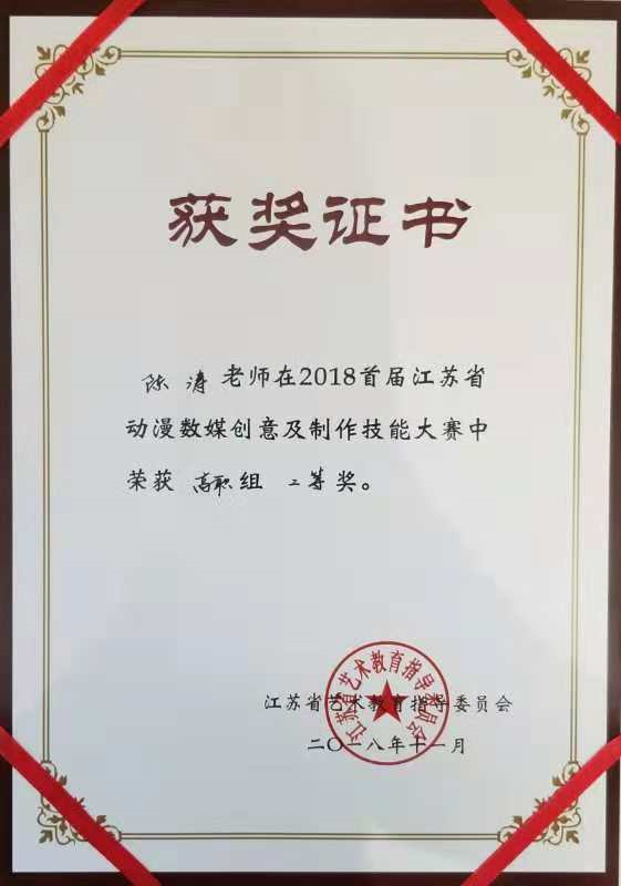 2018年11月19日下午,2018省首届江苏省动漫数媒创意及制作技能大赛颁奖典礼在南京工业职业技术学院仙林校区隆重举行。出席颁奖典礼的有省教育厅领导、省艺术教育指导委员会成员、省部分高校领导、专家以及全体获奖教师、学生。我校鲁迅艺术学院陈涛老师参加了此次赛事,最终以较强的专业知识和较高的职业素养获得教师组二等奖的好成绩。