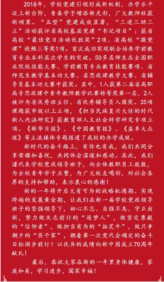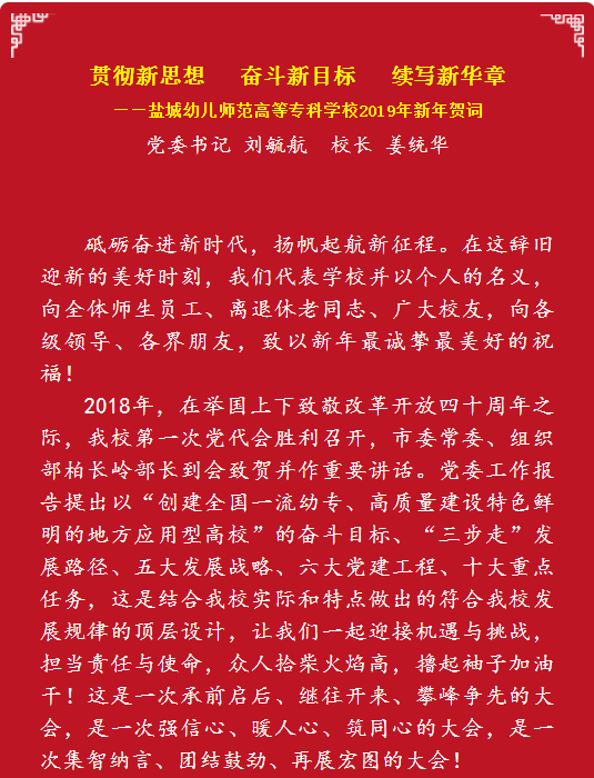 贯彻新思想 奋斗新目标 续写新华章 ——盐城幼儿师范高等专科学校2019年新年贺词