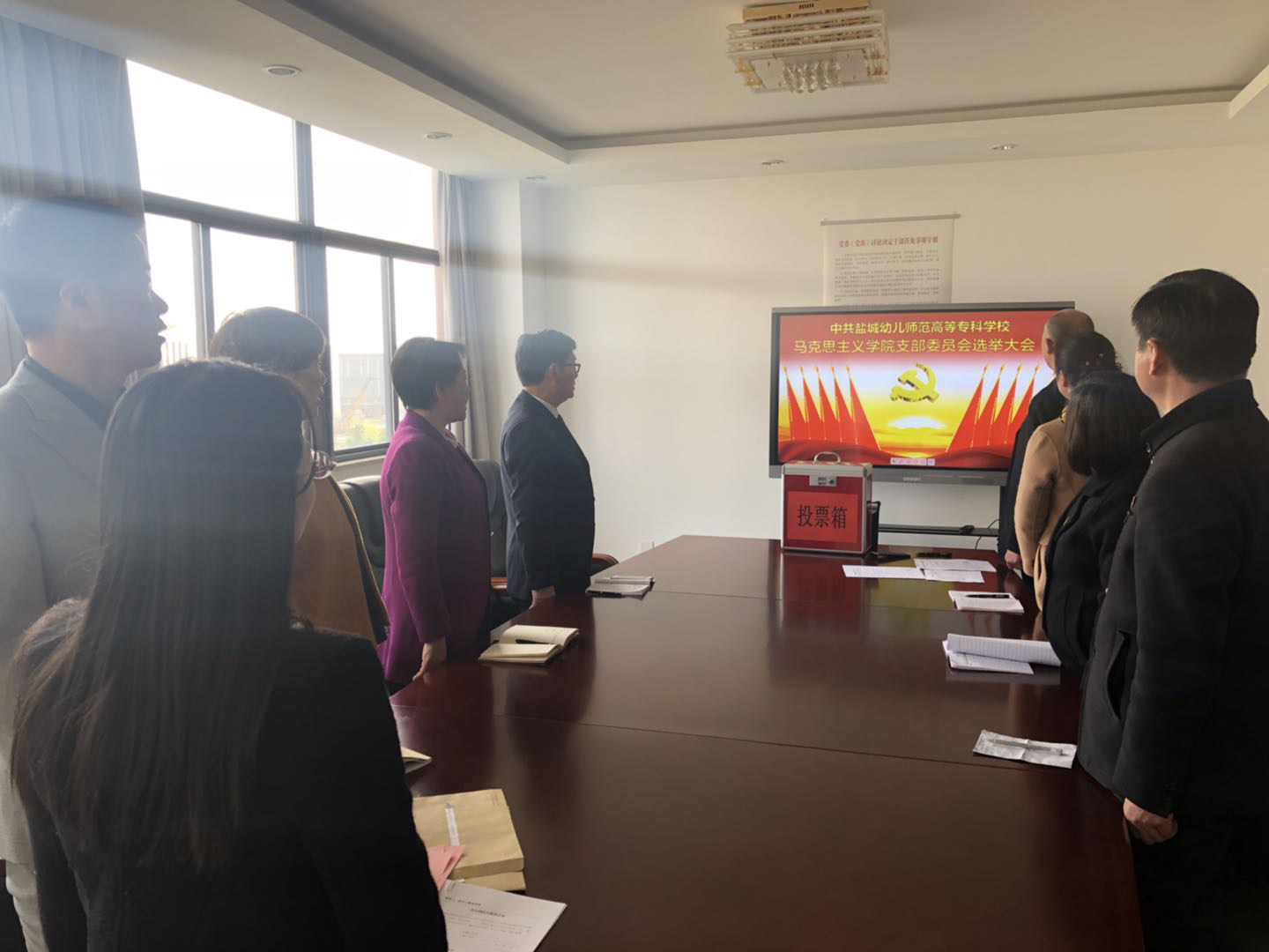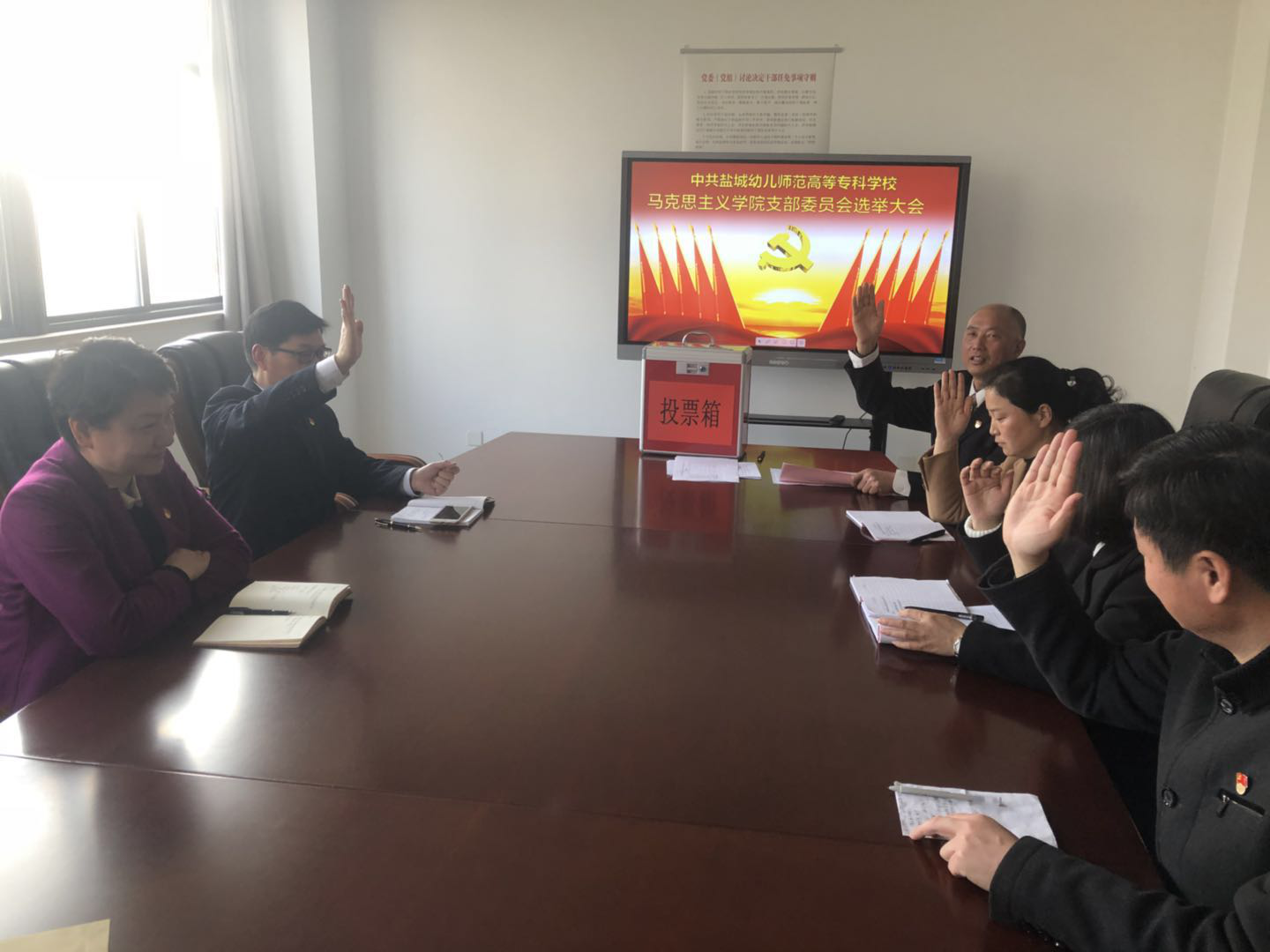 会议在庄严嘹亮的《国歌》声中拉开帷幕。会议共三项议程:一、审议通过《中共盐城幼儿师范高等专科学校马克思主义学院支部委员会选举办法》;二、通过计票人、监票人名单;三、选举支部委员。