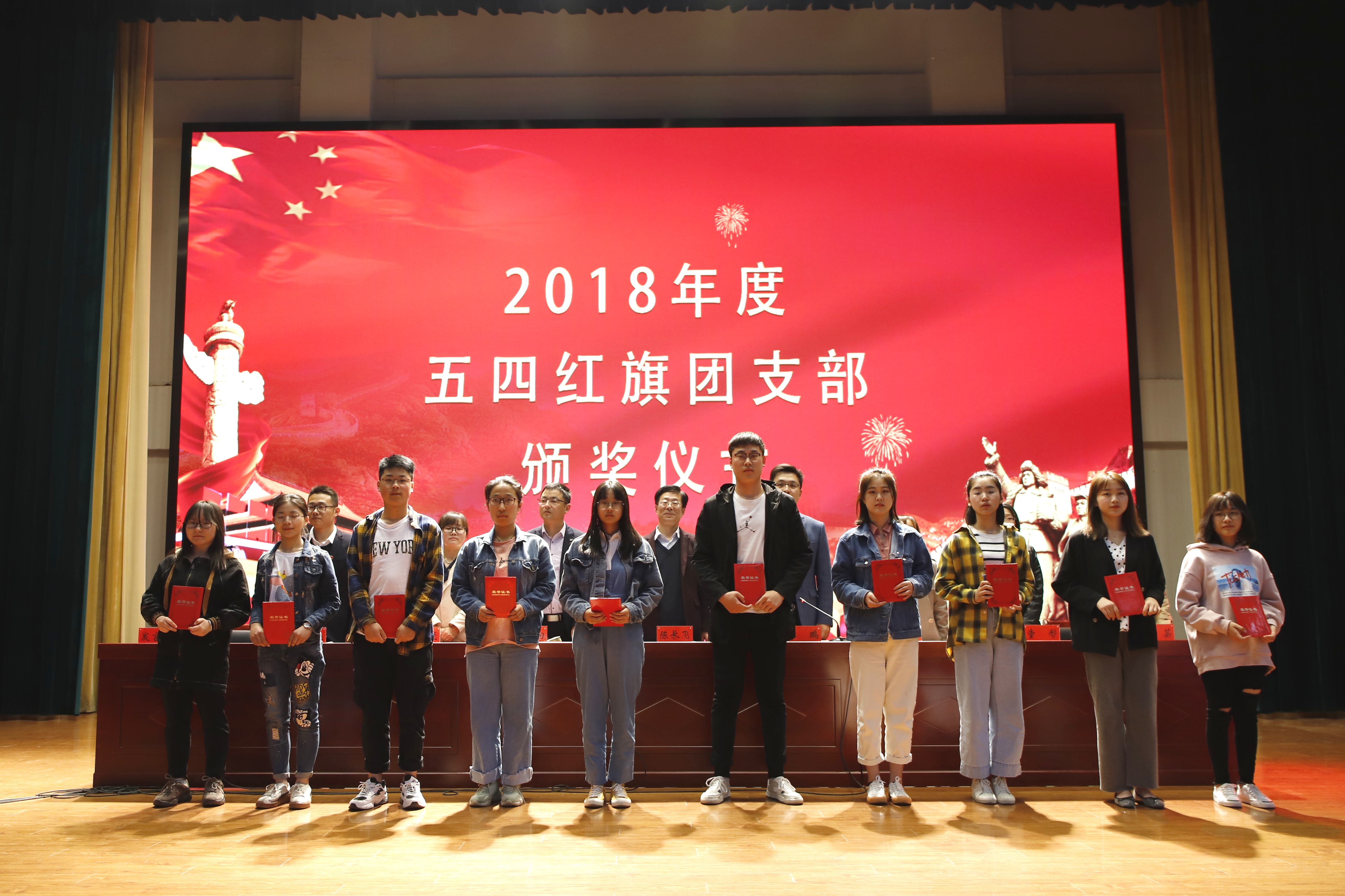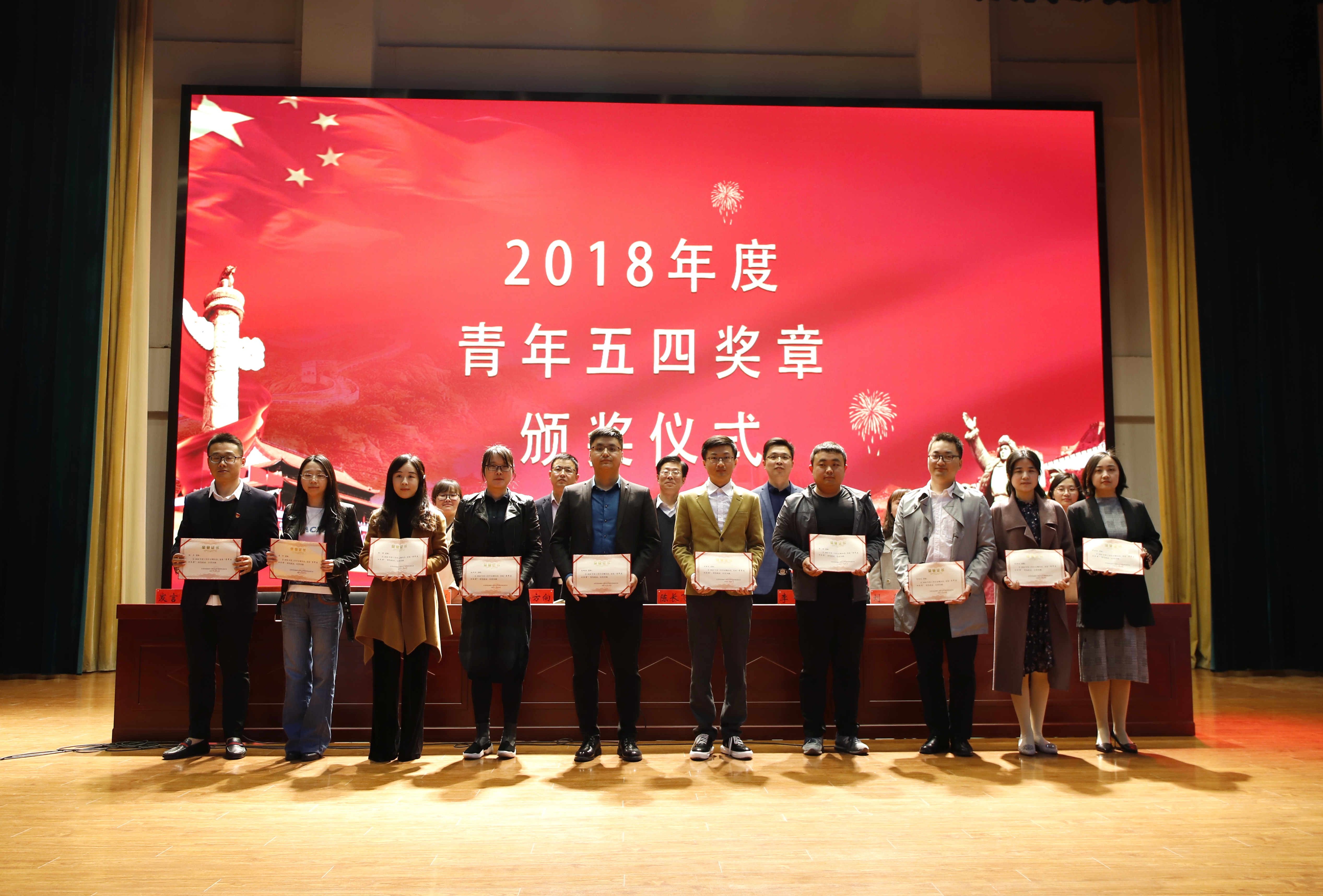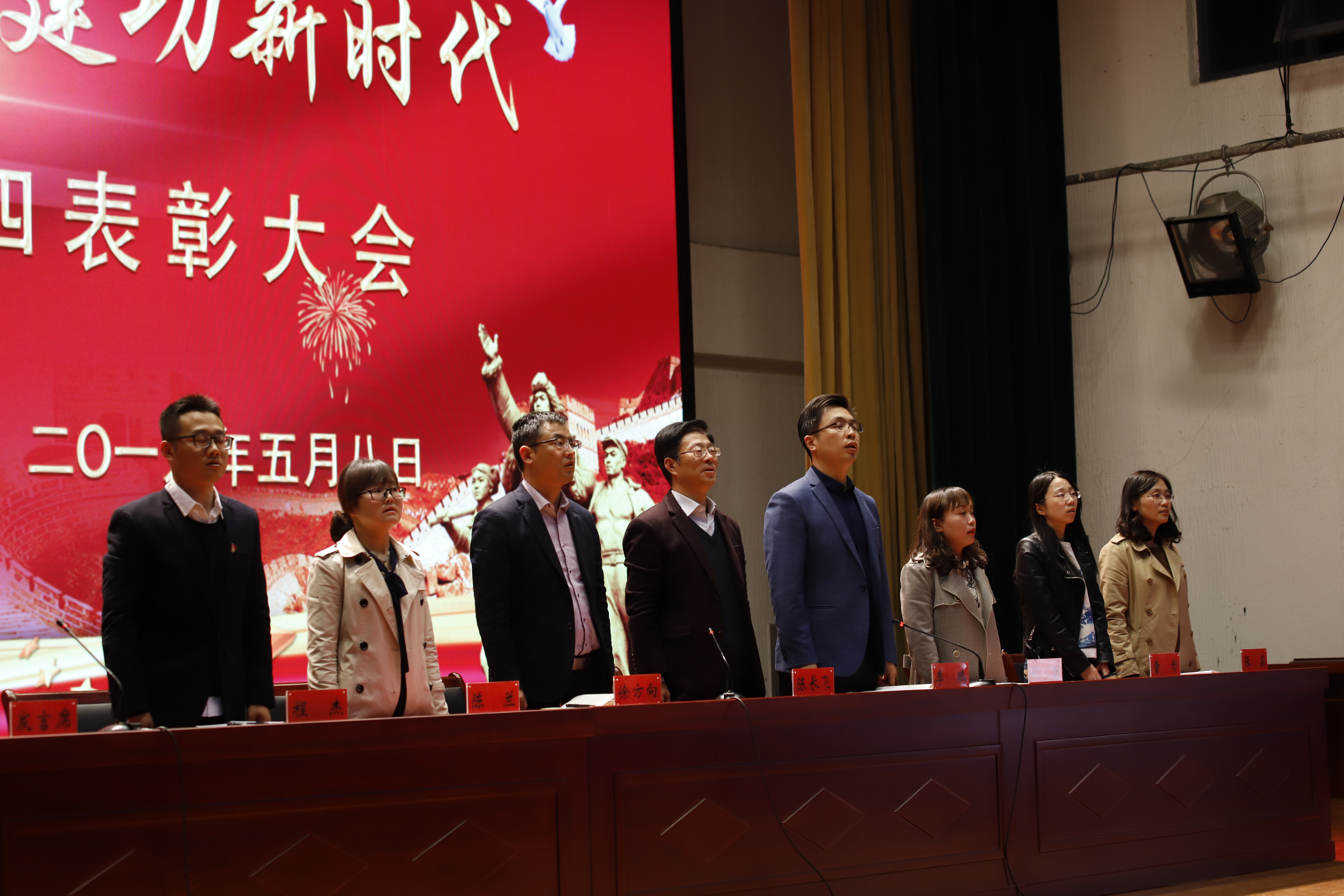 大会在庄严的国歌中拉开帷幕。校团委李鹏宣读了表彰决定,与会领导分别为获得“五四青年奖章”、“优秀共青团干部”、“宣传标兵”、“五四红旗团支部”、“优秀共青团员”、“最美志愿者”和“优秀社团社长”的师生代表颁奖并合影留念。