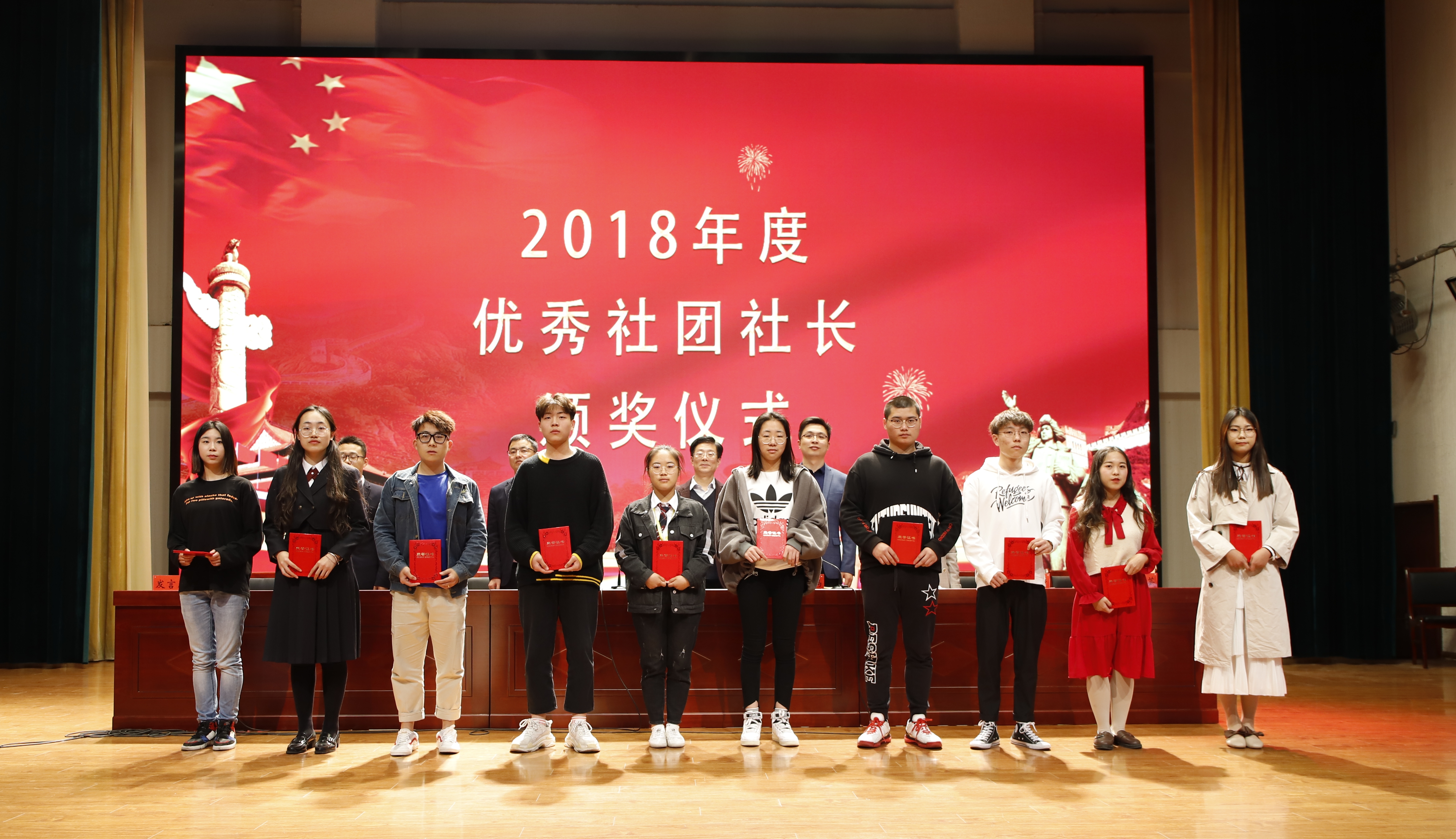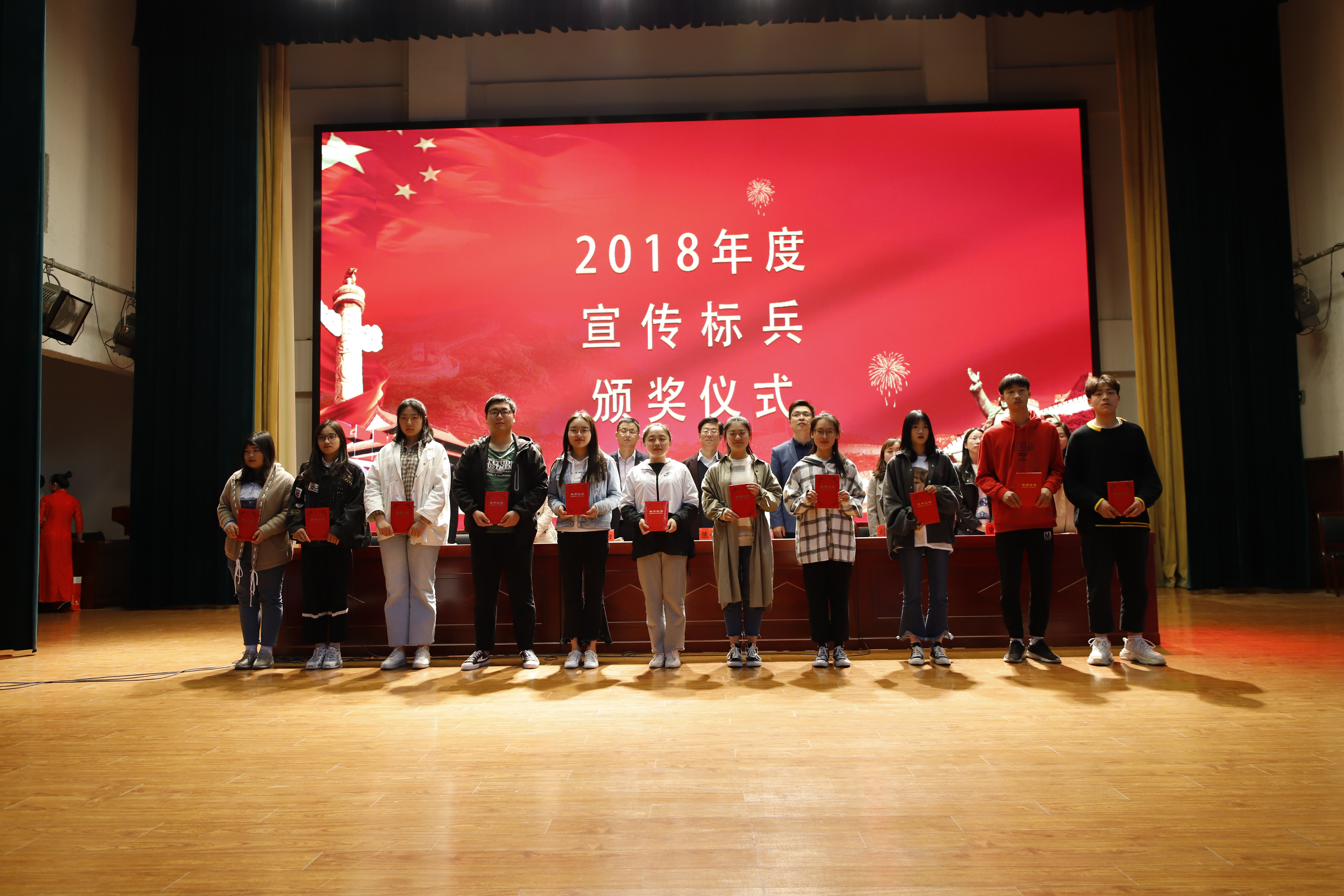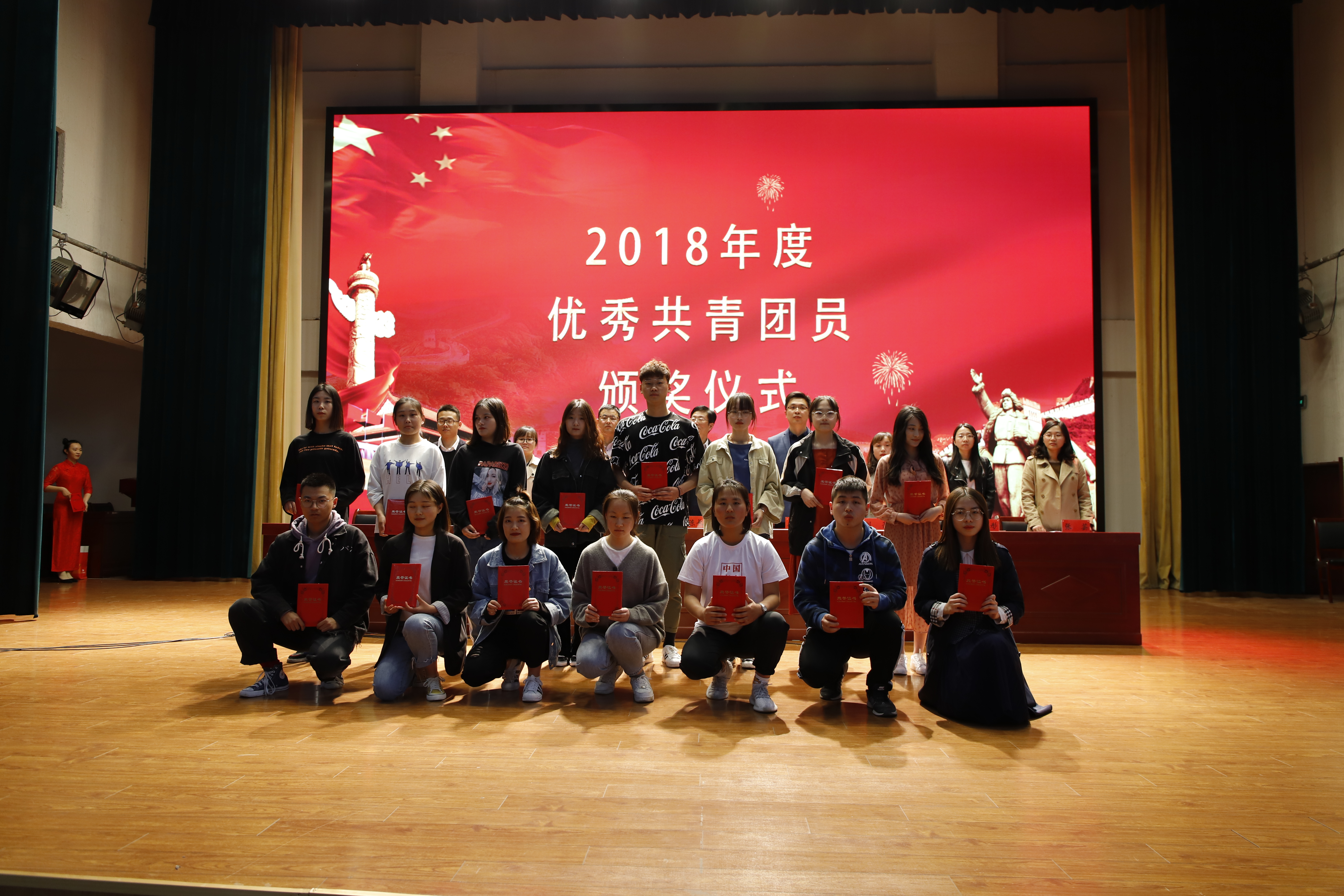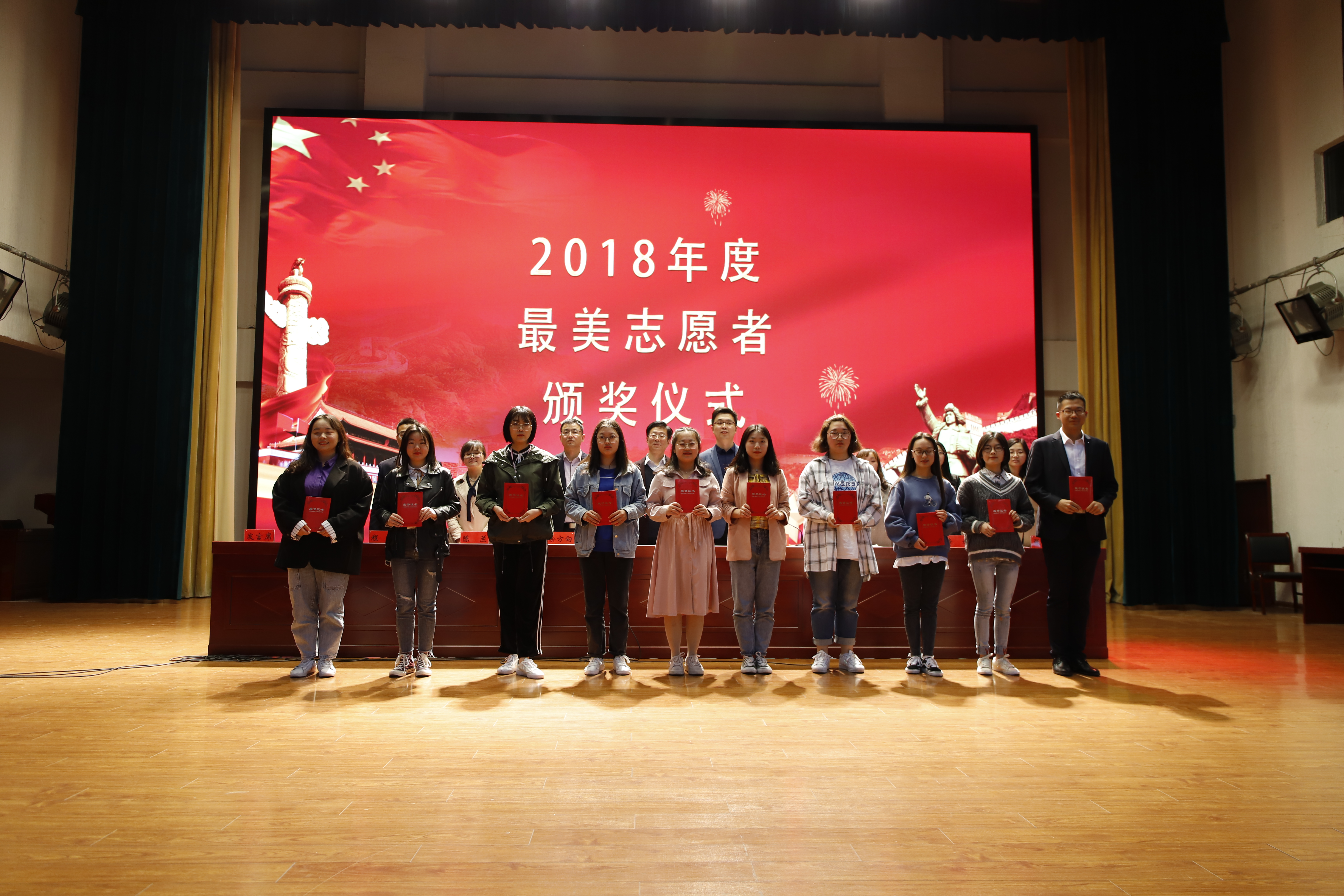 大会在庄严的国歌中拉开帷幕。校团委李鹏宣读了表彰决定,与会领导分别为获得“五四青年奖章”、“优秀共青团干部”、“宣传标兵”、“五四红旗团支部”、“优秀共青团员”、“最美志愿者”和“优秀社团社长”的师生代表颁奖并合影留念。