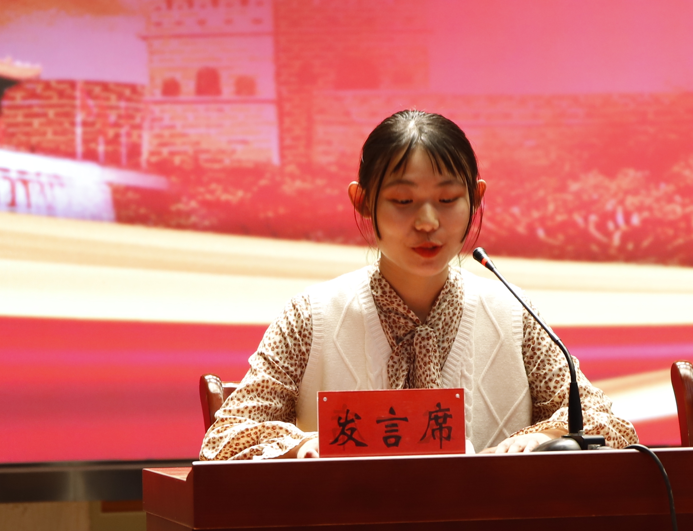 袁怡同学代表获奖青年学生发言,她号召同学们积极参与学校举办的各类活动;充分发挥模范带头作用;积极践行社会主义核心价值观。以时不我待的紧迫感,以舍我其谁的责任感,在中国特色社会主义建设中,谱写出无愧于青春、无愧于时代的壮丽篇章!