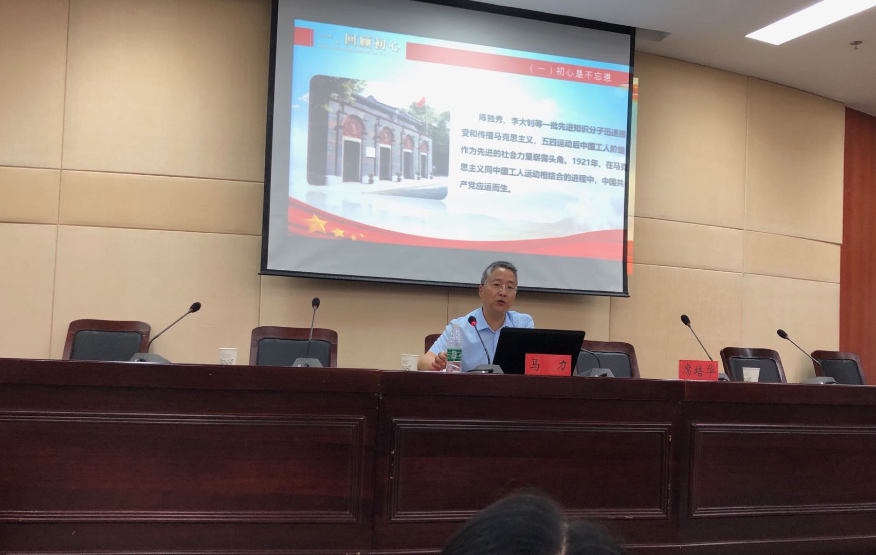 2019年5月27日下午四点半,人文教育学院全体党员、入党积极分子在北校区图文信息中心一楼大报告厅开展了“不忘初心”党课活动。学院邀请校党委委员、纪委书记马力同志上了一堂生动的党课——“不忘初心才能永远年轻”。
