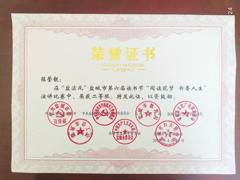 近日,由中共盐城市委宣传部、中共盐城市委市级机关委员会、盐城市教育局、盐城市文化广电和旅游局、盐城市总工会、共青团盐城市委员会、盐城市妇女联合会联合主办的 “盐渎风”盐城市第六届读书节活动中,我校师生再获佳绩。在本次活动中,我校积极组织师生参与读书征文比赛、演讲比赛,取得了可喜的成绩。