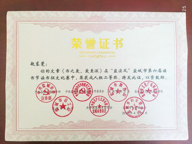 赵东莞——撰写的文章《书之爱,爱至深》荣获读书征文比赛成人组二等奖