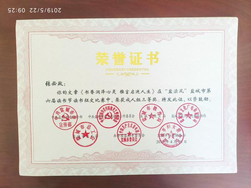 张必政——撰写的文章《书香润泽心灵 雅言启迪人生》荣获读书征文比赛成人组三等奖