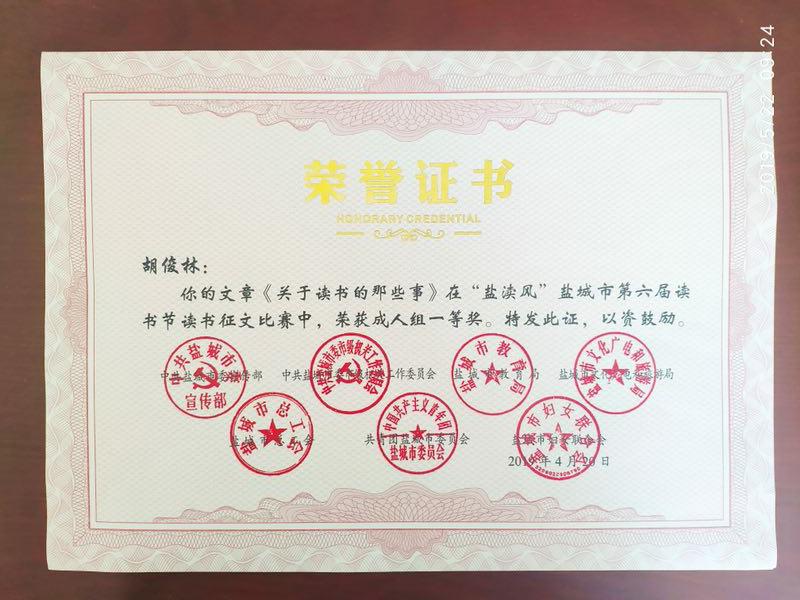 胡俊林:《关于读书的那些事》获读书征文比赛中,荣获成人组一等奖