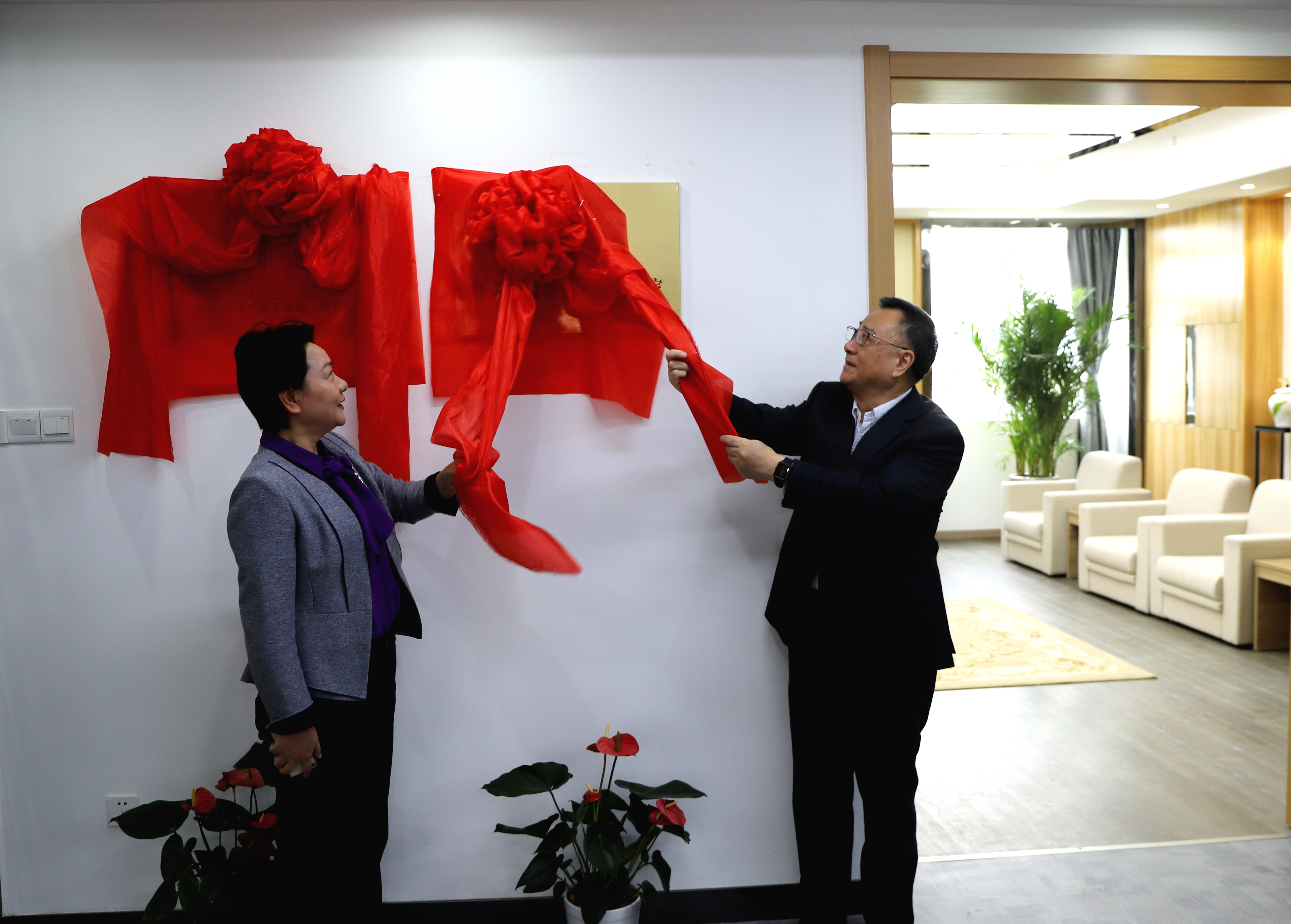 李驰一行首先来到盐城幼儿师范高等专科学校,在“铁军艺苑”前,详细了解鲁艺华中分院的红色历史,革命先烈和前辈不忘初心、浴血奋斗的牺牲精神给大家留下了深刻印象。随后,李驰主席、姜友新副主席一行来到设在我校的省政协“委员之家”,为“江苏省政协委员活动之家”、“鹤鸣书苑”揭牌。