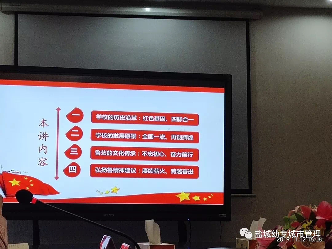 戴永湖委员从学校的历史沿革说起,我校四脉合流,兼具了服务农村的“阜师精神”、润泽基教的“盐师情怀”、华中鲁艺的“红色基因”、盐城建校的“工匠品质”,“扎根盐阜沃土,传承铁军精神”是盐城幼专人的不懈追求;随后戴永湖委员带领大家回眸了学校第一次党代会,重温了第一次党代会中明确的“创建全国一流幼专、高质量建设特色鲜明的地方应用型高校”奋斗目标,介绍了近年来我校鲁艺薪火的传承与发展情况,指出传承和弘扬红色基因,仍然任重道远,我们要立足红色资源,凝聚鲁艺精神鼓舞人,挖掘鲁艺资源吸引人,擦亮红色名片震撼人,创造红色经典教育人。戴永湖委员指出,站在新的起点,我们将立足新时代,投身新实践,传承鲁艺薪火,聚焦立德树人,聚力高质量发展,为加快建成全国一流幼专,建设特色鲜明的地方应用型高校砥砺前行!