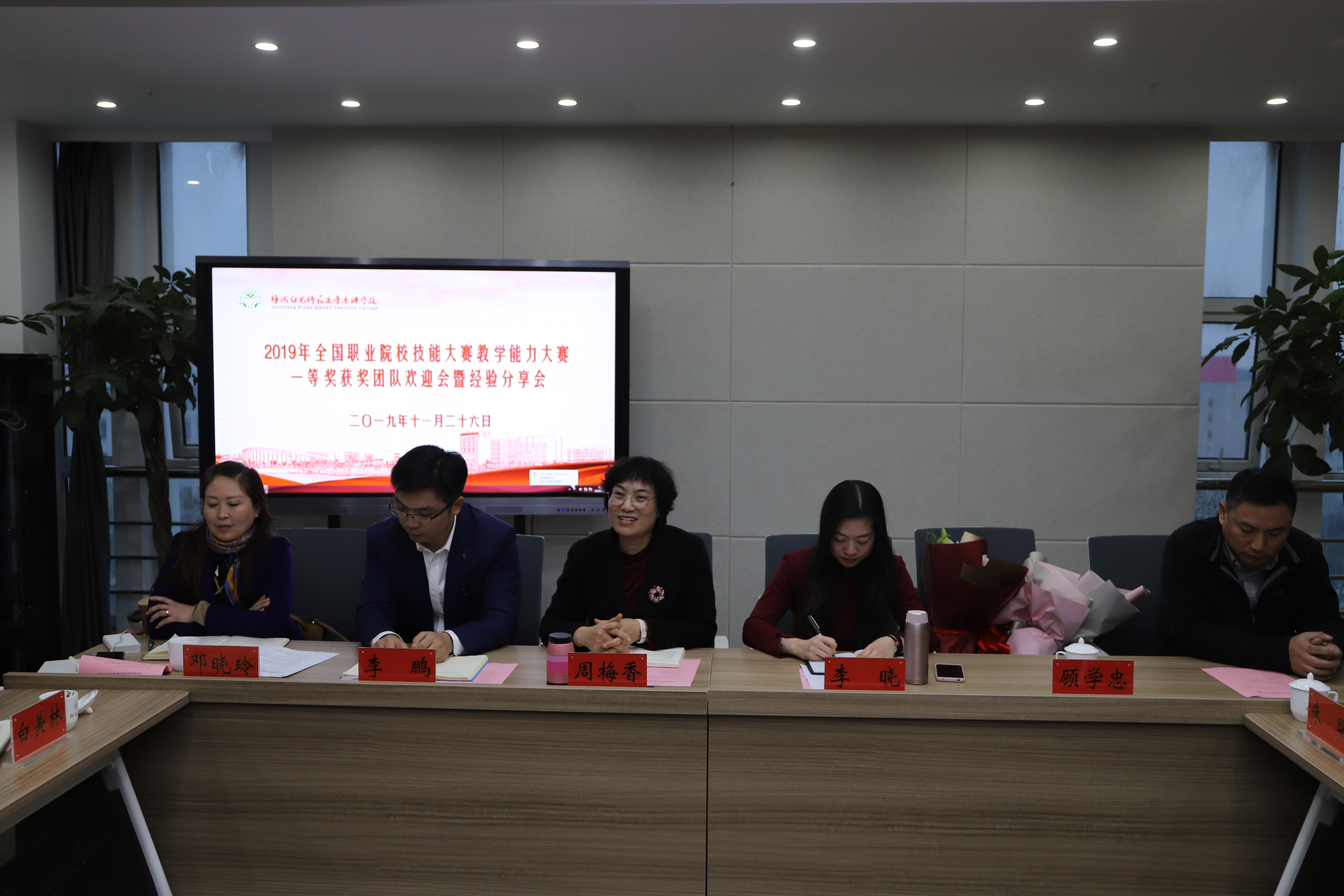 11月26日下午四点,在北校区图文信息中心六楼多功能活动中心学校召开2019年全国职业院校技能大赛教学能力比赛一等奖获奖团队欢迎会暨经验分享会。校党委书记刘毓航、校长姜统华、各二级学院院长、分管教学院长、各教研室主任、教务处处长、人事处处长、信息中心主任、质量管理与评估中心主任出席会议。