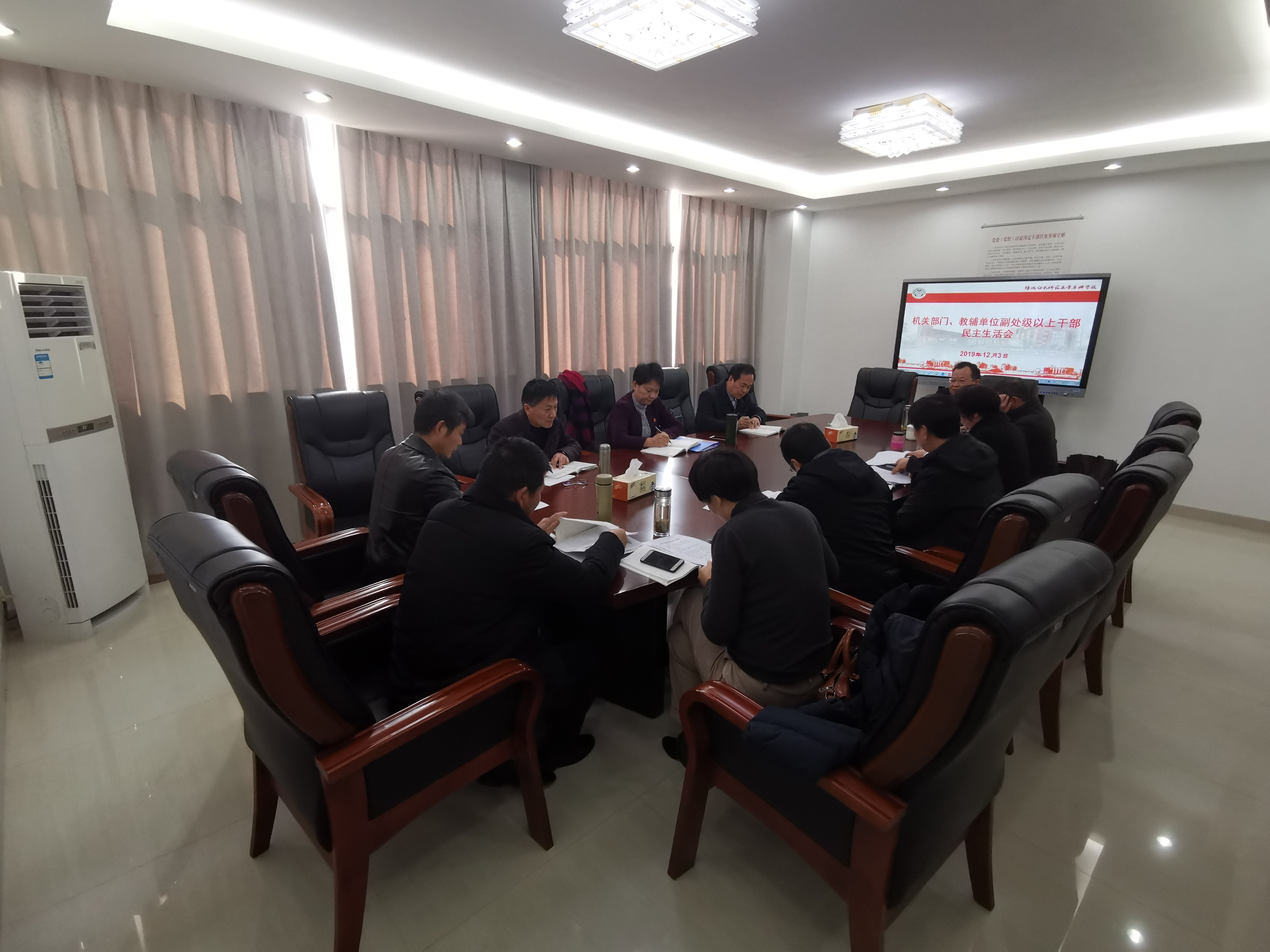 12月3日下午2时,教辅单位副处级以上干部、相关部门负责人民主生活会在南校区五楼小会议室举行。校党委书记刘毓航、校主题教育督查组长蔡正栋教授到会指导,于卫东、陈红、周梅香、陆立新、白美林、葛红梅、周加林、秦春等中层干部参加了民主生活会,会议由机关第一党总支书记李明主持。