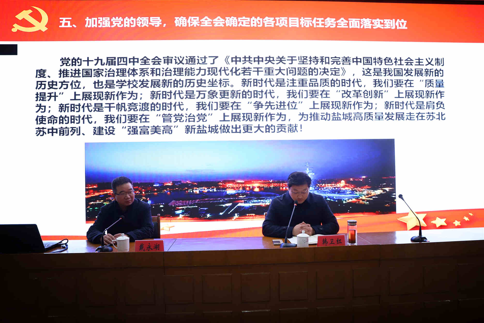 为深入学习宣传贯彻党的十九届四中全会精神,引导广大党员干部把思想统一到党的十九届四中全会精神上来,把力量凝聚到党的十九届四中全会作出的各项重大部署上来,根据市委统一部署,12月11日下午,市委宣讲团成员、盐城幼儿高等师范专科学校党委委员、宣传部部长戴永湖同志在盐城高级职业学校作专场宣讲。盐城经贸高级职业学校党总支书记、校长韩卫红同志主持会议。