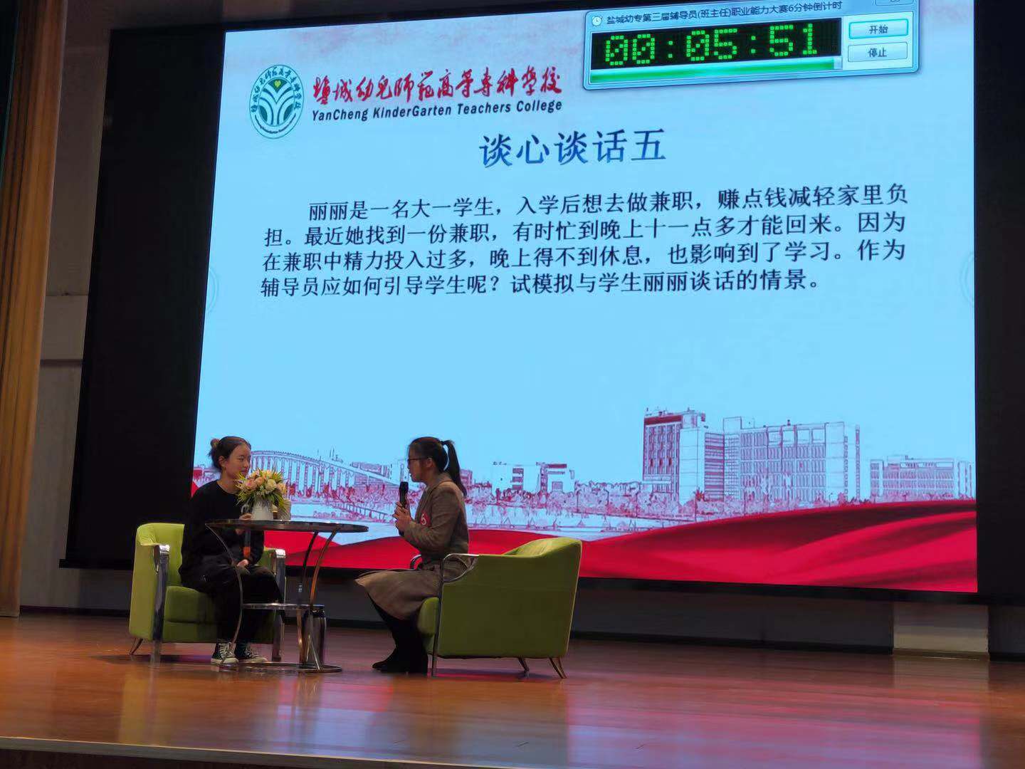 在谈心谈话环节,参赛选手现场抽题,针对当前学生工作中遇到的热点难点问题在台上与助演学生一起真实还原辅导员的日常工作,展示出我校辅导员(班主任)扎实的理论功底与丰富的工作经验。在理论宣讲环节,参赛选手对国家政策方针、思政教育等理论解读准确、表述生动,联系实际紧密,赢得了在场观众的阵阵掌声。