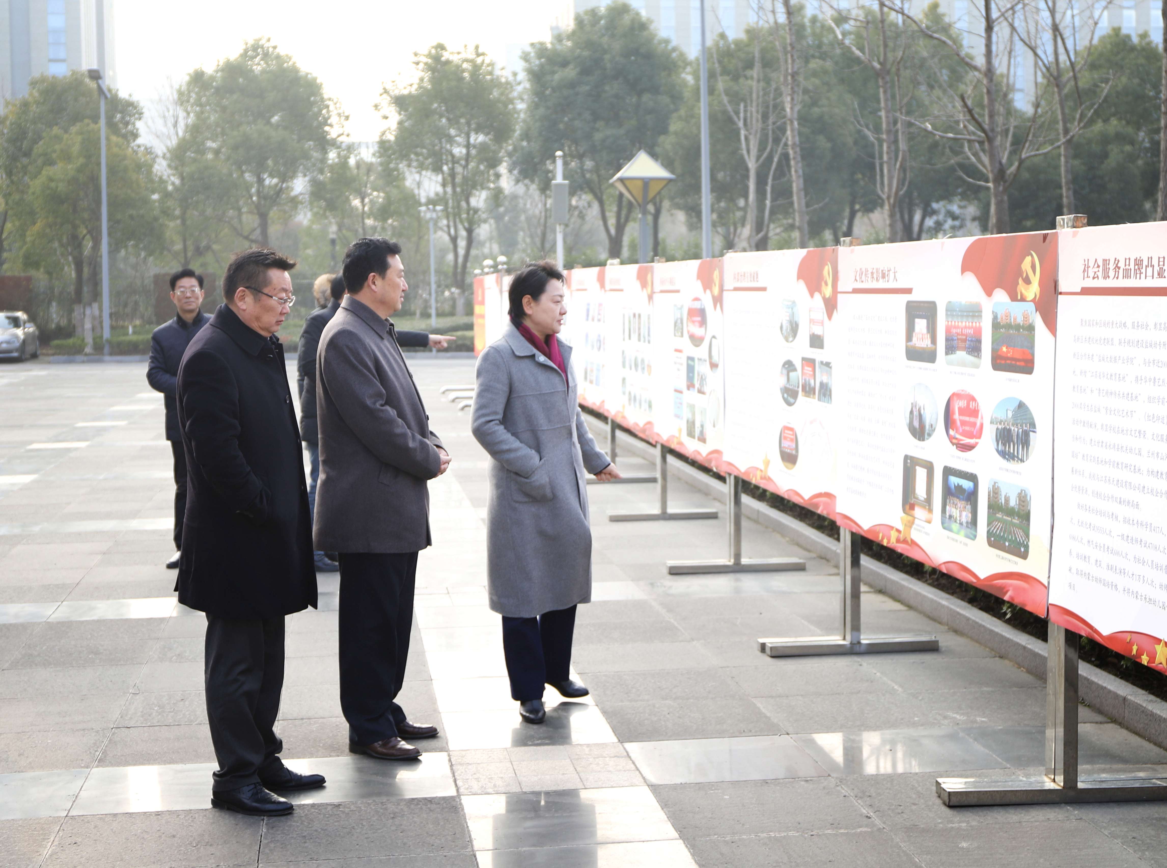 会前,周广展组长一行在刘毓航书记、姜统华校长的陪同下,参观了“用汗水浇灌收获,以实干笃定前行”——盐城幼儿师范高等专科学校高质量发展剪影图片展。