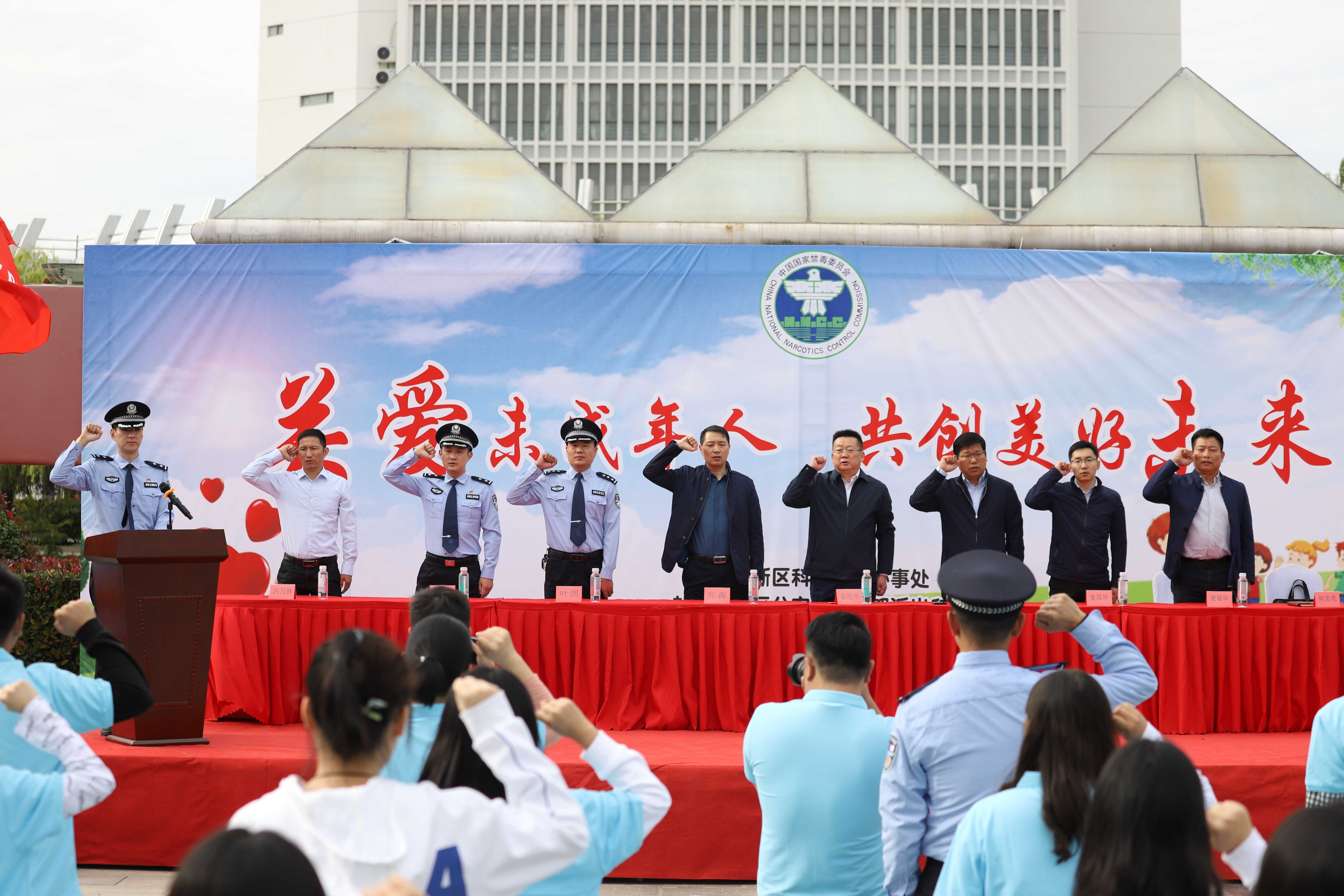 10月14日下午,我校安保处联合盐南高新区科城街道在海洋路校区开展“关爱未成年人,共创美好未来”的禁毒主题宣传活动。校长姜统华,科城街道办事处主任宋浩,政法委书记童国林,社会管理中心主任冯乃林,新都派出所教导员叶剑,副所长何忠亮,区公安分局禁毒大队副大队长施源,区政法委主任张森,安保处处长谢福华等领导出席活动。科城街道禁毒宣传工作志愿者服务队、部分党员群众、我校教师、学生代表参加活动。