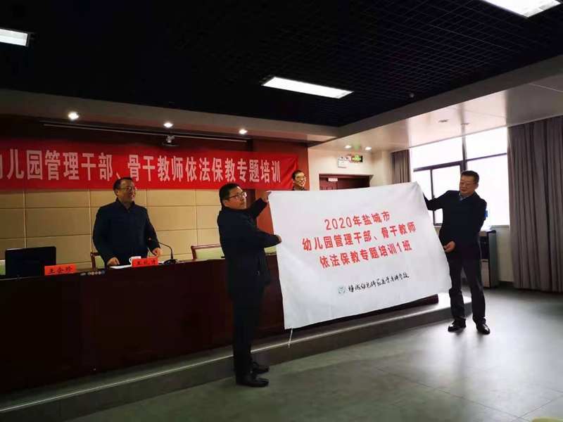 开班伊始,所有领导、老师整理衣襟,轻声站立,高声齐唱国歌,拉开了培训的帷幕。接着,姜统华校长致辞并提要求,他首先介绍了我校的基本情况,近几年尤其是今年取得的令人欣喜的成绩,然后对学员提了4点希望。来自盐城市幼儿园的陈园主任代表学员做了表态发言。然后,姜校长亲自将班旗交给了本次培训班的班主任孙锦涛科长,赢得学员的热烈掌声,学员们反映,这在以前的培训班上是没有的,很新奇。