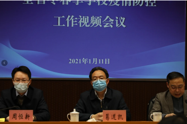 省教育厅厅长葛道凯简要回顾总结了一年来全省教育系统抗击新冠肺炎疫情取得的成绩,分析了冬春季学校疫情防控形势的严峻性、复杂性,部署强调了当前和今后一个时期必须抓好的六个方面重点工作:一要认真落实学校疫情防控方案。二要科学精准做好寒假和开学疫情防控。三要严密防范境外疫情输入。四要强化校园管控和留校学生管理服务。五要积极引导师生和家长加强防护。六要组织开展自查自纠和专项检查。葛厅长强调,要认真贯彻落实国家和省委省政府决策部署,科学严谨、求真务实,奋力夺取校园疫情防控和教育改革发展的双胜利,以优异成绩迎接建党100周年。