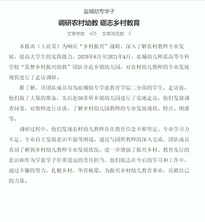 盐阜大众报:盐城幼专学子调研农村幼教 砺志乡村教育