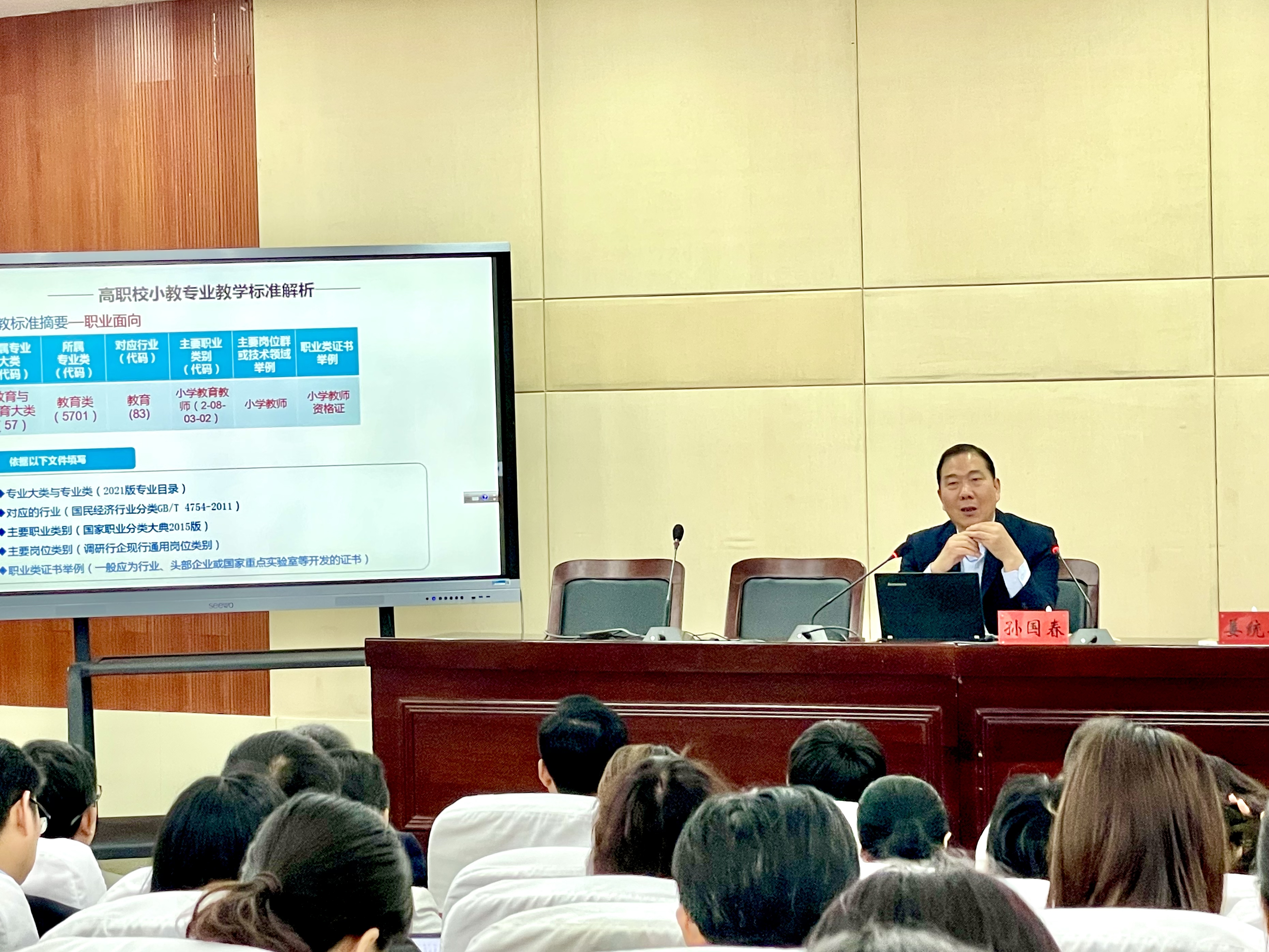 孙校长在讲座中紧紧围绕高职校小学教育专业教学标准,层层分析解读。在他的报告中,既有前沿理论的阐述,又有详尽的调研数据,还有丰富的案例解析,对我校在新形势下的小学教育专业人才培养方案的修订有极大的启示。
