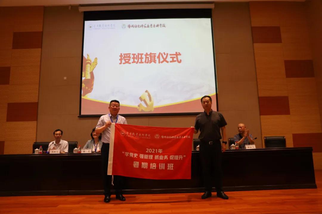 开班仪式上姜统华校长和龚永坚书记共同为培训班授旗。