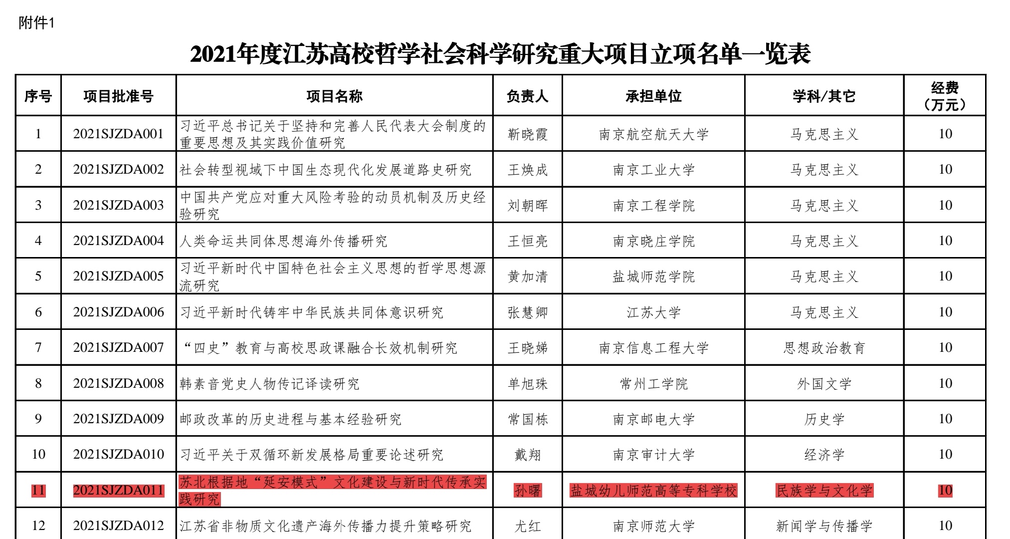 热烈祝贺我校孙曙教授的课题《苏北根据地“延安模式”文化建设与新时代传承实践研究》获批2021年度江苏高校哲学社会科学研究重大项目,实现了我校在此获批项目中的突破。