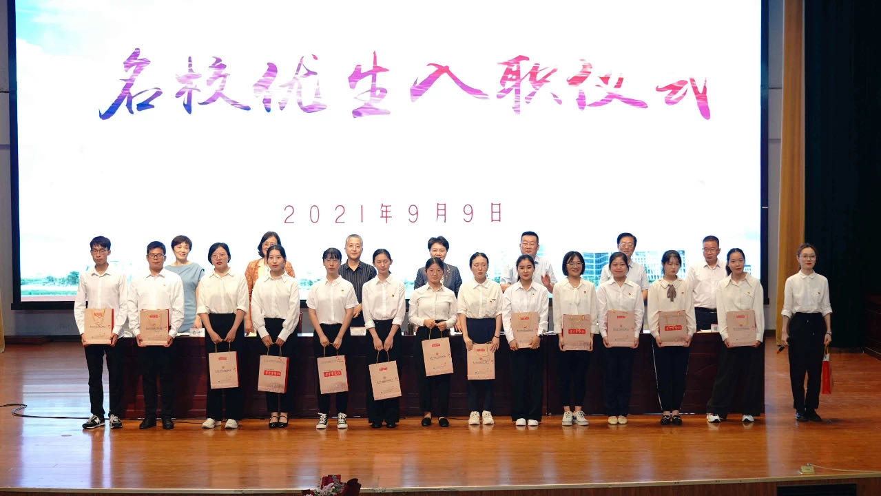 名校优生入职仪式、校领导为名校优生发放入职“礼”袋、青蓝结对仪式