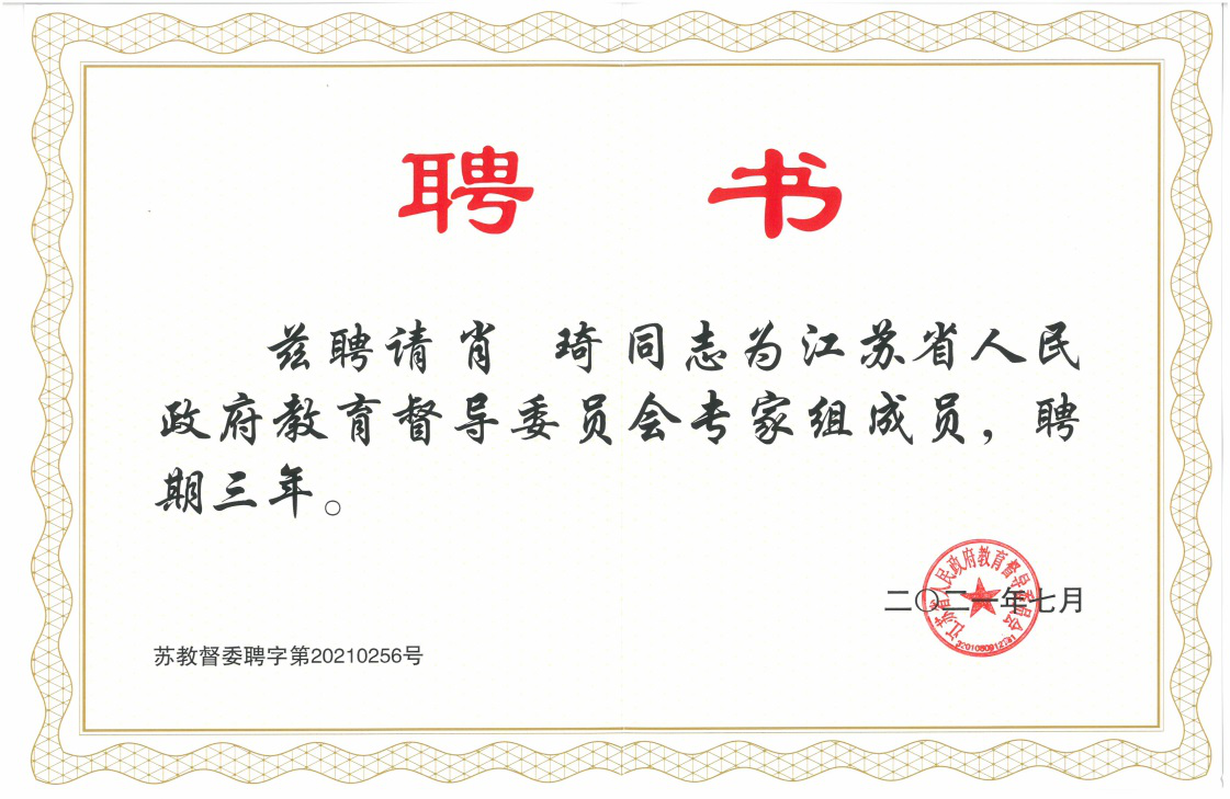 近日,省政府教育督导委员会办公室公布第九届江苏省人民政府督学及专家组成员选聘人员名单,我校党委书记刘毓航教授受聘为江苏省人民政府督学、学前教育研究所所长肖琦副教授受聘为专家组成员。