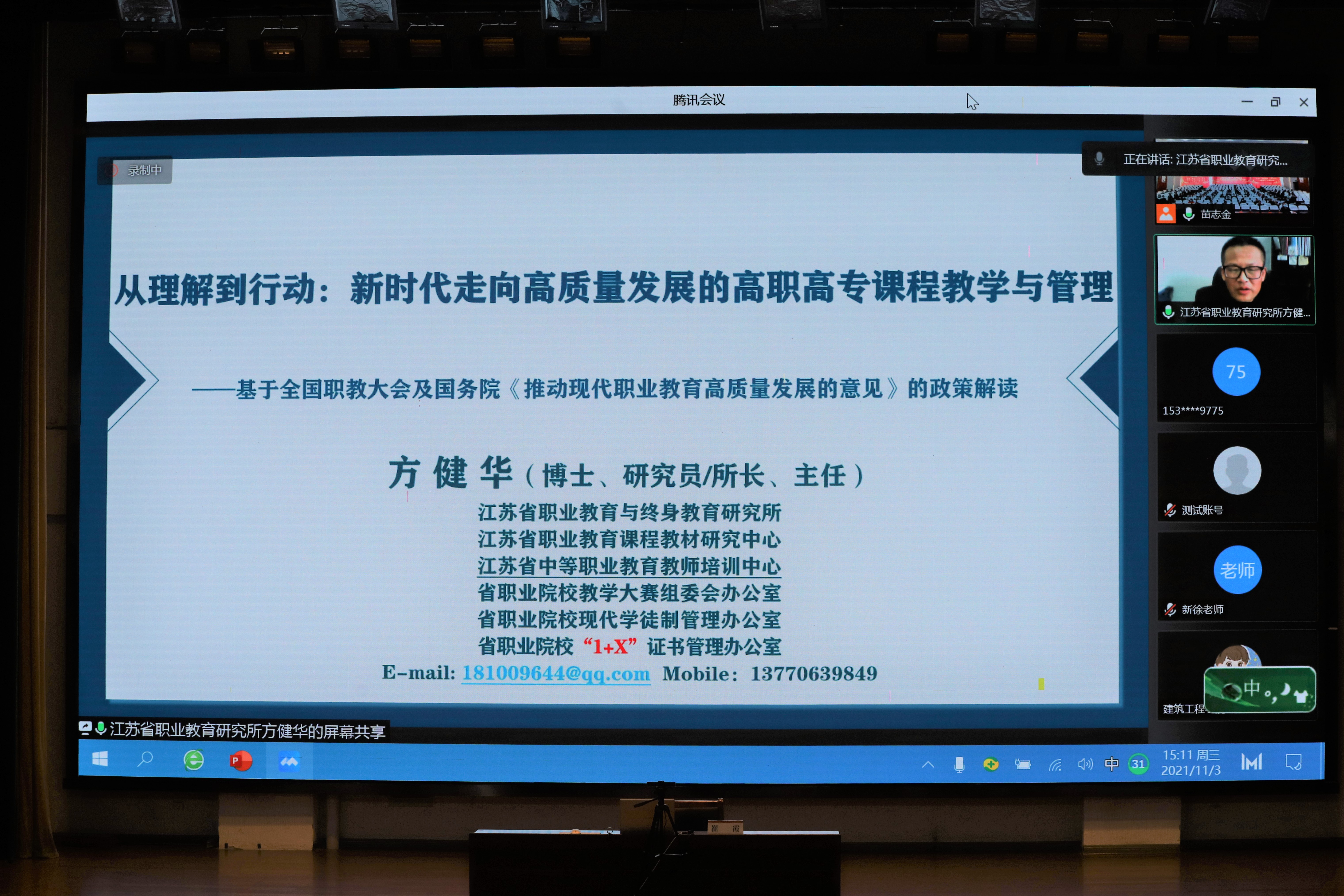 江苏省职业教育与终身教育研究所所长方健华基于全国职教大会及国务院《推动现代职业教育高质量发展的意见》进行政策解读,开展了题为《从理解到行动:新时代走向高质量发展的高职高专课程教学与管理》的讲座。