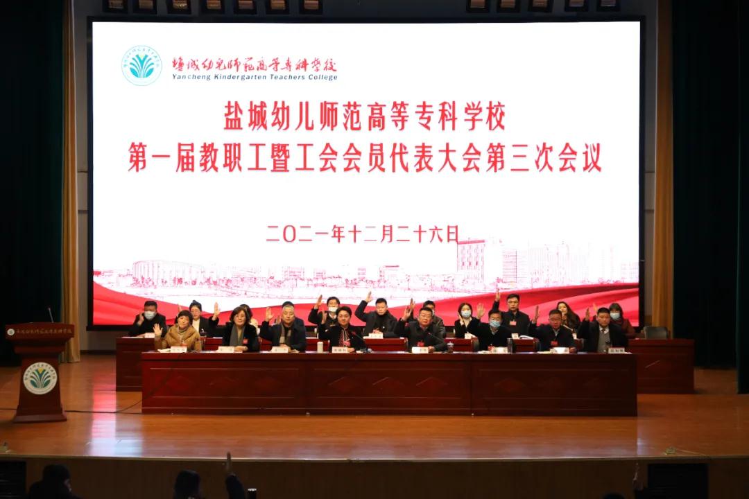 大会表决通过《盐城幼儿师范高等专科学校“十四五”事业发展规划》、《盐城幼儿师范高等专科学校二级教职工代表大会实施办法》(讨论稿)、《盐城幼儿师范高等专科学校工会经费支出管理实施办法(第二版)》(讨论稿)、《盐城幼儿师范高等专科学校第一届教职工代表大会暨工会会员代表大会第三次会议决议》。
