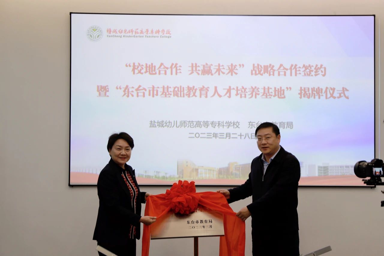 3月28日,我校与东台市教育局战略合作签约暨“东台市基础教育人才培养基地”揭牌仪式在海洋路校区举行。东台市委副书记、副市长张志东,东台市教育工委书记、东台市教育局党委书记、局长王华平,东台市教育局学前科科长缪进军等莅临我校,校党委书记刘毓航、校长姜统华、副校长崔霞及相关部门、学院负责人出席活动。活动由我校学前教育研究所承办。