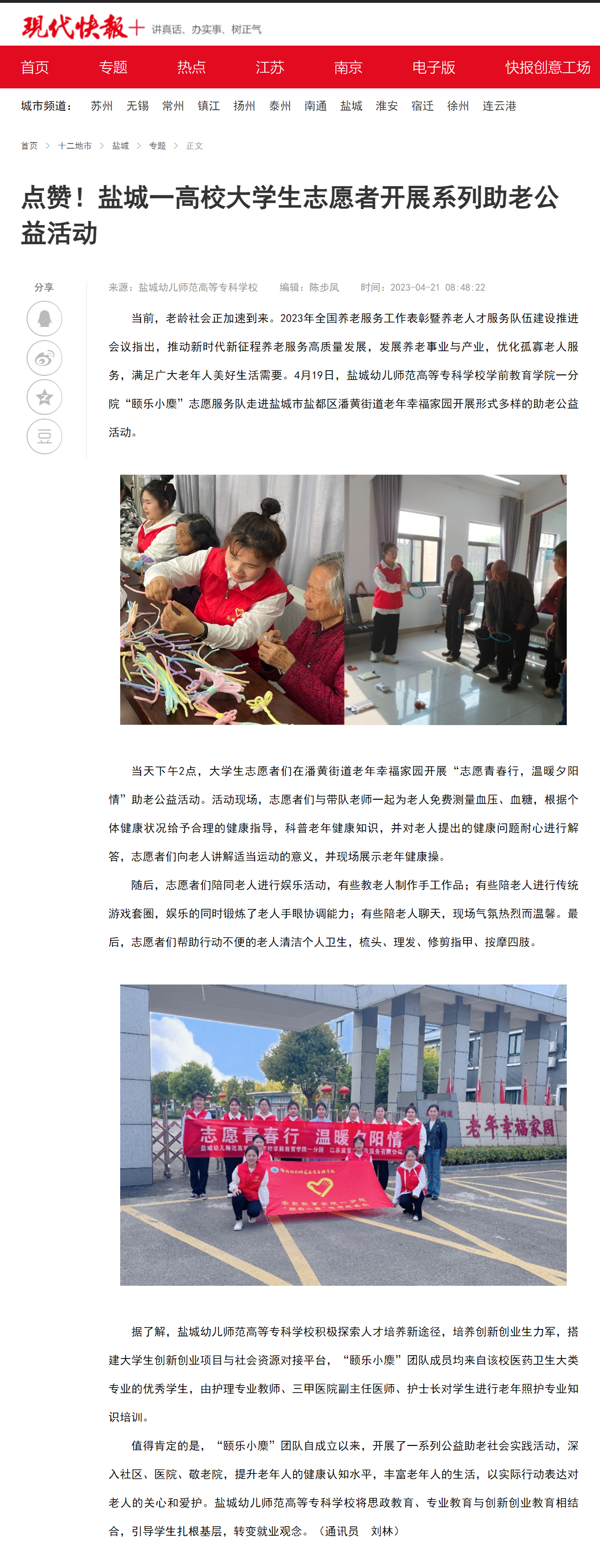现代快报:点赞!盐城一高校大学生志愿者开展系列助老公益活动