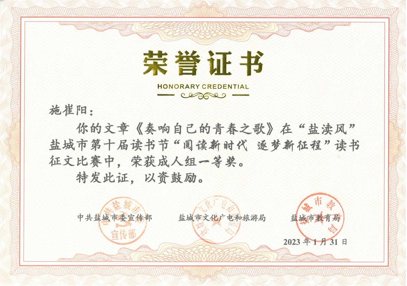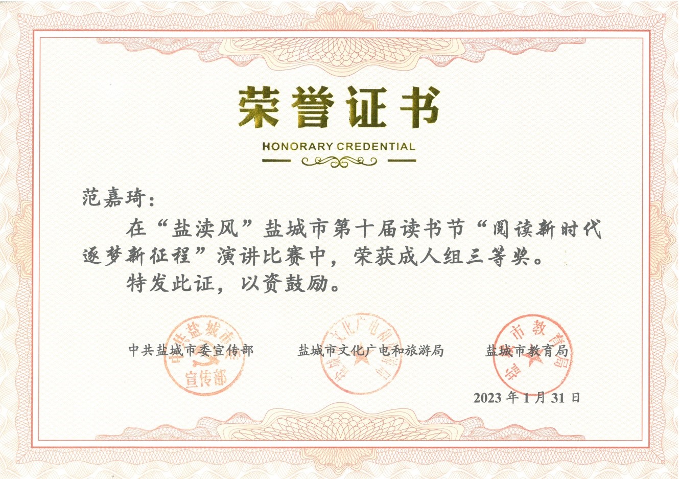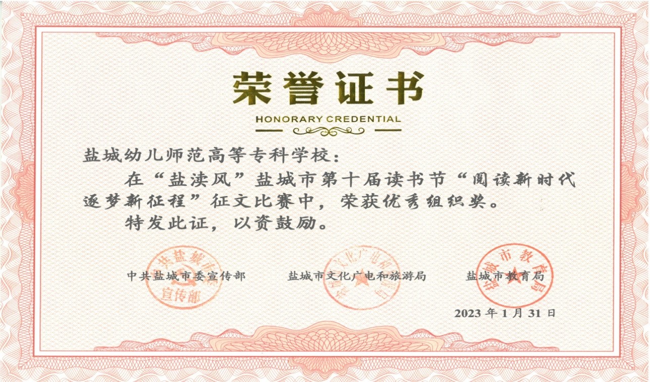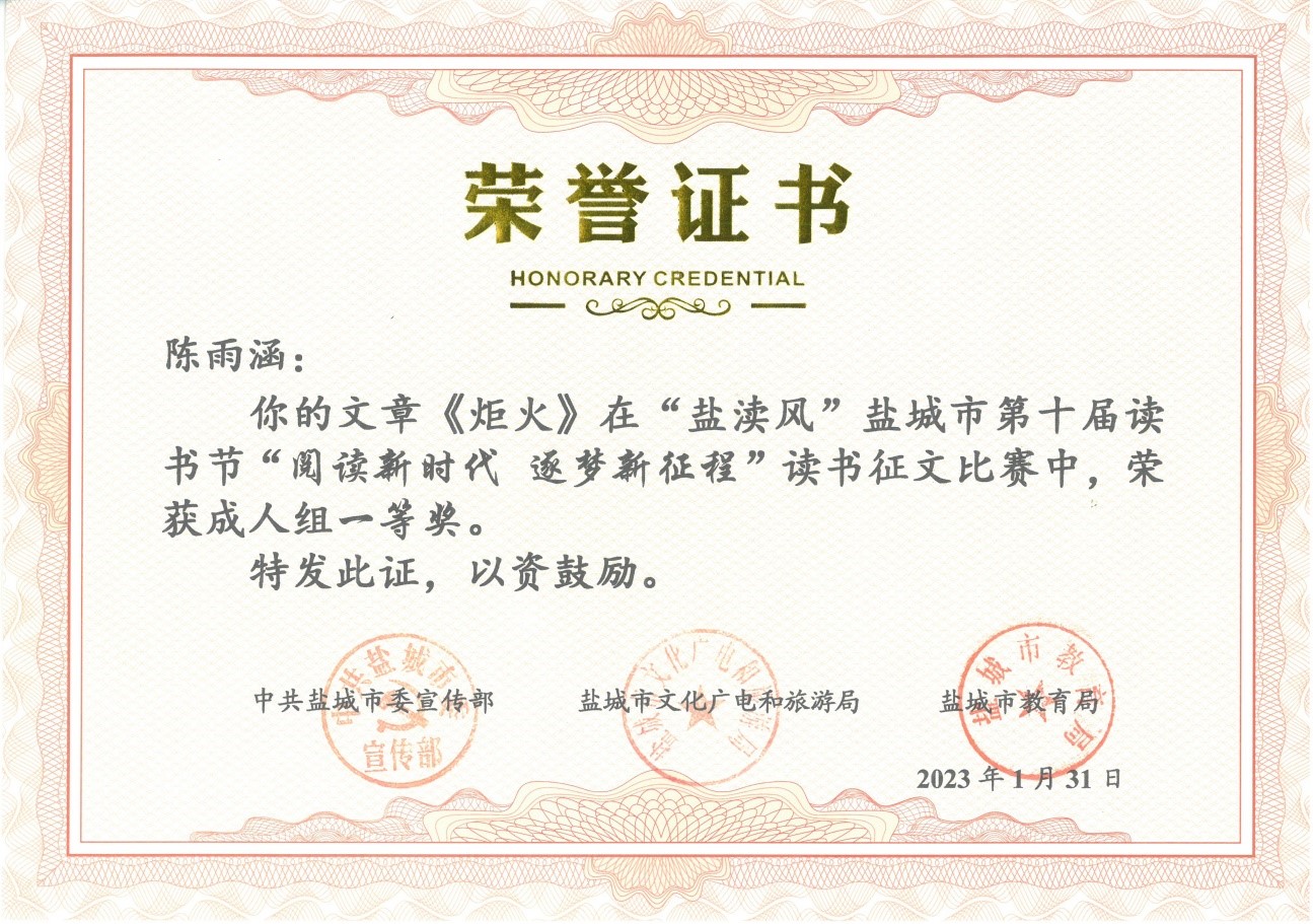 在中共盐城市委宣传部、盐城市文化广电和旅游局、盐城市教育局联合主办的 “盐渎风”盐城市第十届读书节活动中,我校参赛学生荣获“阅读新时代 逐梦新征程”征文比赛一等奖2名,二等奖3名,学校荣获优秀组织奖。在演讲比赛活动中,范嘉琦同学与县市区选送的十位选手同台竞技,喜获三等奖。特此祝贺!