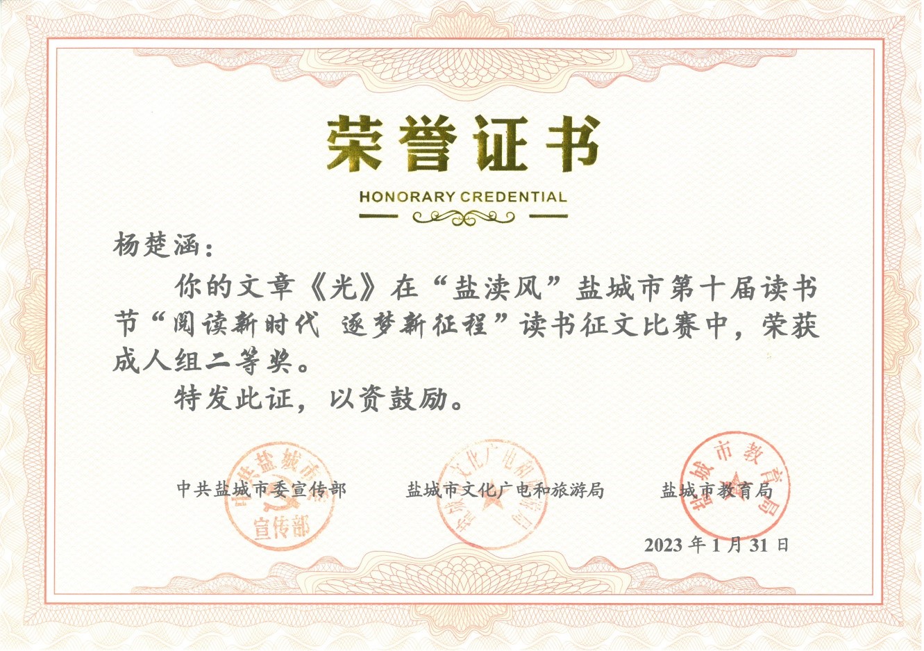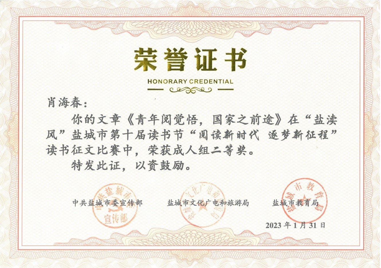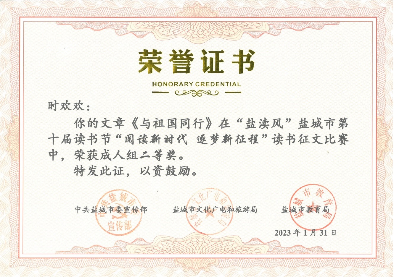 在中共盐城市委宣传部、盐城市文化广电和旅游局、盐城市教育局联合主办的 “盐渎风”盐城市第十届读书节活动中,我校参赛学生荣获“阅读新时代 逐梦新征程”征文比赛一等奖2名,二等奖3名,学校荣获优秀组织奖。在演讲比赛活动中,范嘉琦同学与县市区选送的十位选手同台竞技,喜获三等奖。特此祝贺!
