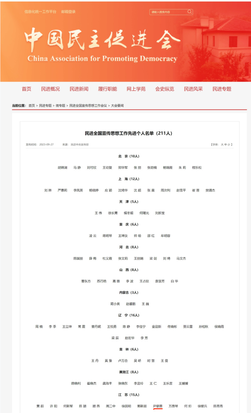 近日,五年一次的民进全国宣传思想工作会议在北京召开。会议对149个“民进全国宣传思想工作先进集体”和211名“民进全国宣传思想工作先进个人”进行了表彰。我校尹藜蓉老师荣获“民进全国宣传思想工作先进个人”荣誉称号。这是我校民进会员首次获此殊荣,也是首次荣获民进中央表彰。