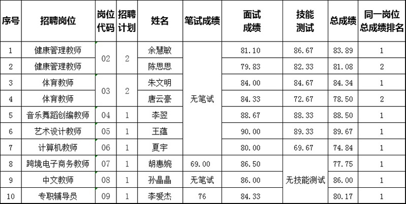 根据《盐城幼儿师范高等专科学校2023年公开招聘工作人员公告》,经个人报名、资格审核、现场确认、笔试、面试、技能测试、体检、考察等程序,拟录用余慧敏等10人,现将名单进行公示。公示时间:11月20日-11月28日。