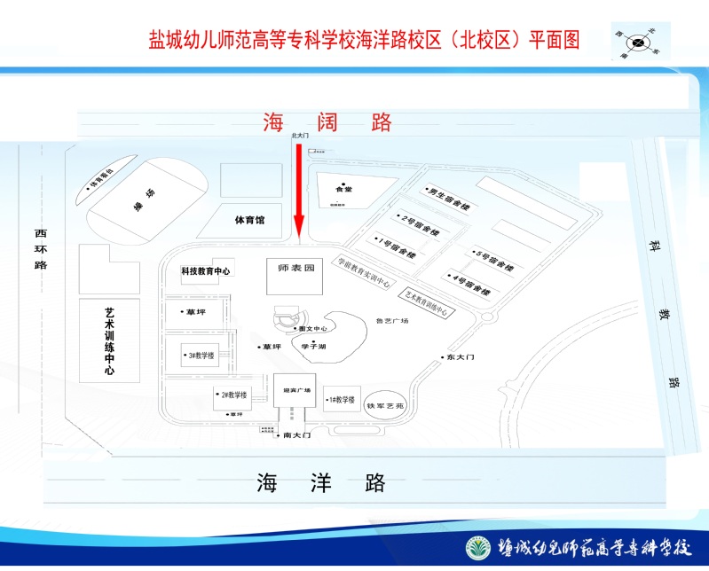 请从盐城幼儿师范高等专科学校北校区的北门进入校区——位于海阔路上,具体路线见平面图