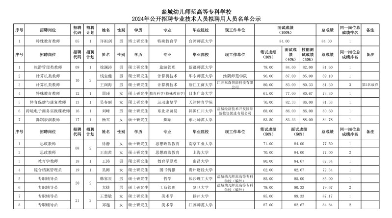 盐城幼儿师范高等专科学校2024年公开招聘专业技术人员拟聘用人员名单公示