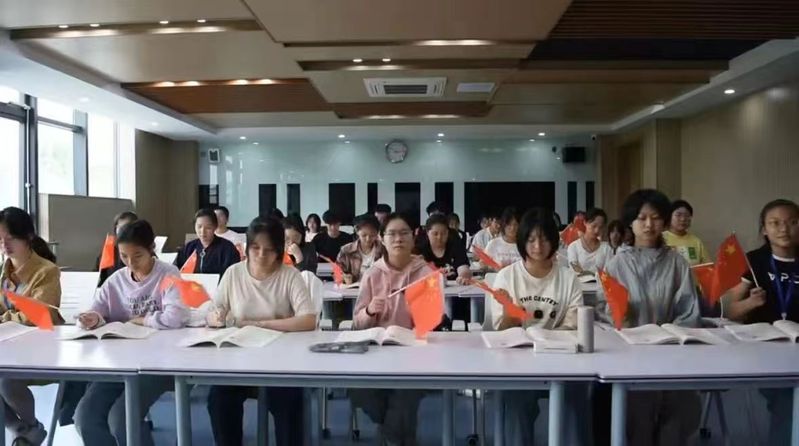 声乐老师顾阳卿满怀激情地组织学生齐唱《我和我的祖国》。青年学生们以饱满的热情和坚定的信念,齐声高歌,用嘹亮的歌声传递着对祖国的深厚热爱和美好祝福。他们的歌声激昂有力,洋溢着青春的旋律,彰显出年轻一代的热血与梦想。