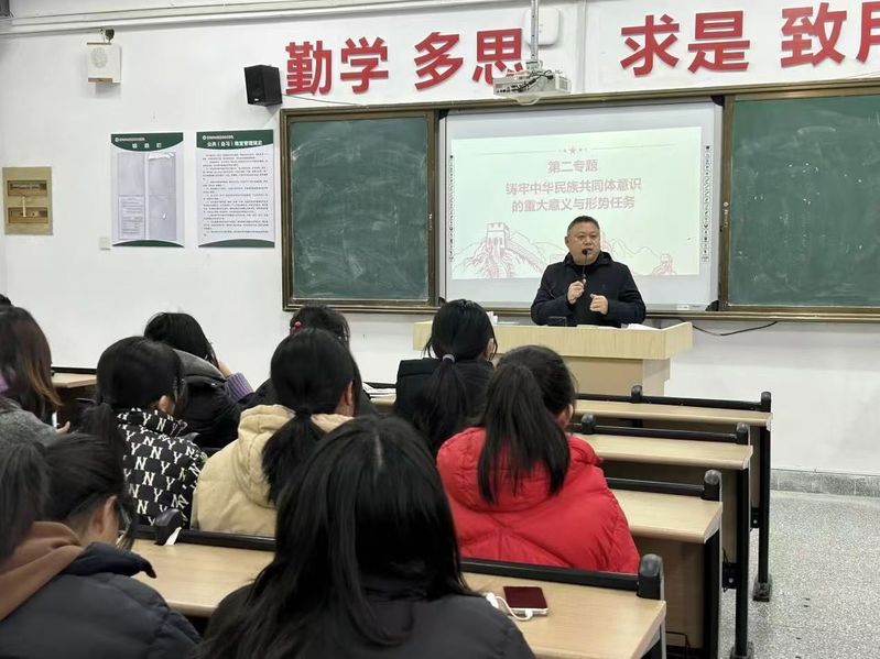 陈书记从四个维度深入剖析了讲座的核心主题:首先,他探讨了中华民族共同体意识的深邃内涵,揭示了这一意识在历史长河中的发展脉络;其次,他回顾了百年来中华民族共同体意识如何不断丰富和深化,展现了其在不同历史时期的演变;接着,他分析了在当前时代背景下,铸牢中华民族共同体意识的迫切需求,强调了其对于国家发展和社会进步的重要性;最后,他提出了在新时代新征程中,如何将铸牢中华民族共同体意识落到实处的具体措施。讲座内容充实、案例生动,不仅让同学们对铸牢中华民族共同体意识有了更全面的理解,也使他们深刻体会到了这一任务的重大意义和时代使命。他们充分认识到,中华民族共同体意识的培养和强化不仅是全党全国各族人民的共同责任,更是促进各民族和谐共处、推动国家繁荣发展的重要基石。