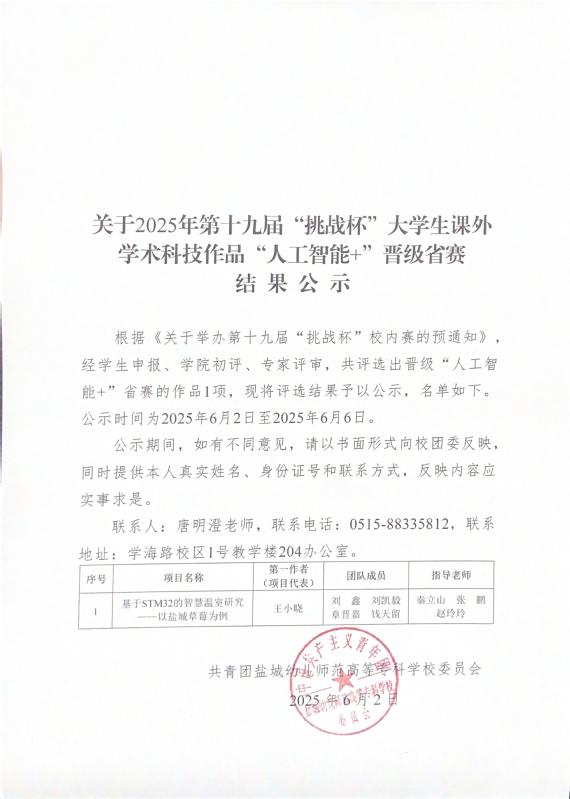 关于2025年第十九届“挑战杯”大学生课外 学术科技作品“人工智能+”晋级省赛 结果公示