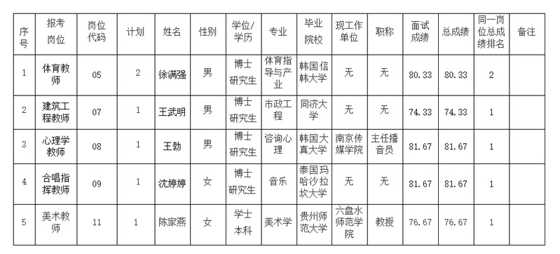 根据《盐城幼儿师范高等专科学校2025年公开招聘高层次人才公告》,经个人报名、资格审查、考察、体检等程序,确定徐满强等5人为拟聘用对象,现将名单进行公示。公示时间:2025年8月15日-8月25日。如有异议,请在公示期内实名反映。
